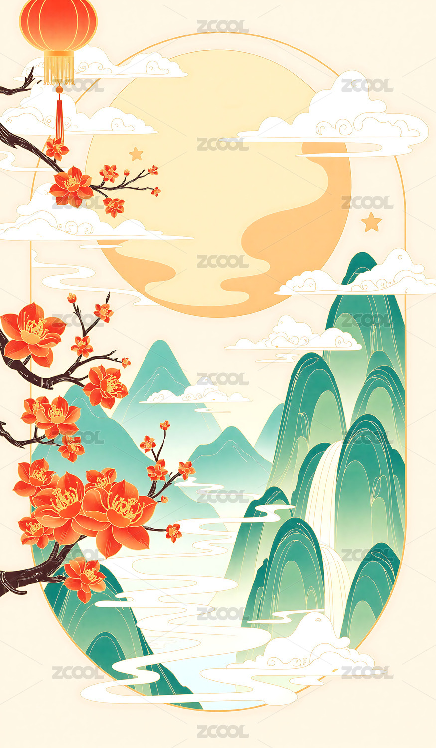 国风国潮山水花月夜插画
