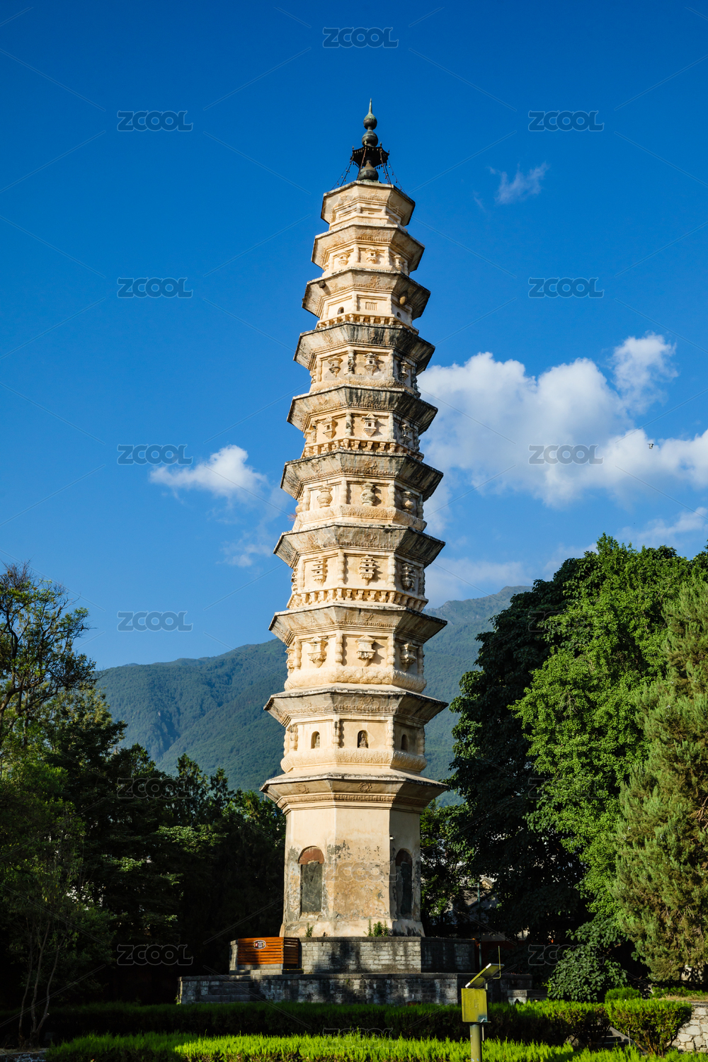 中国云南省大理蓝天白云下的崇圣寺三塔景观
