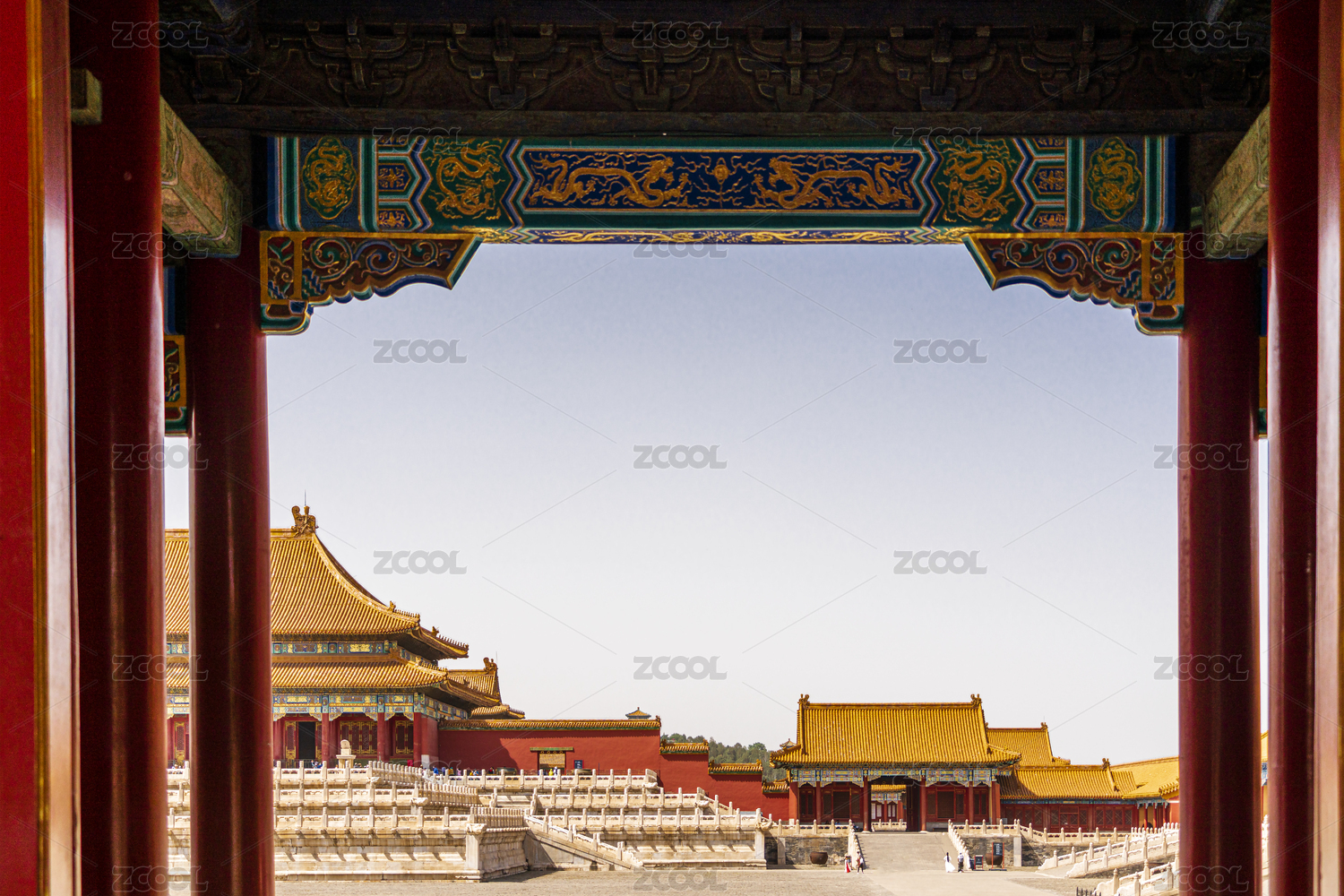 中国北京故宫雕梁画柱的门廊及宫殿房檐