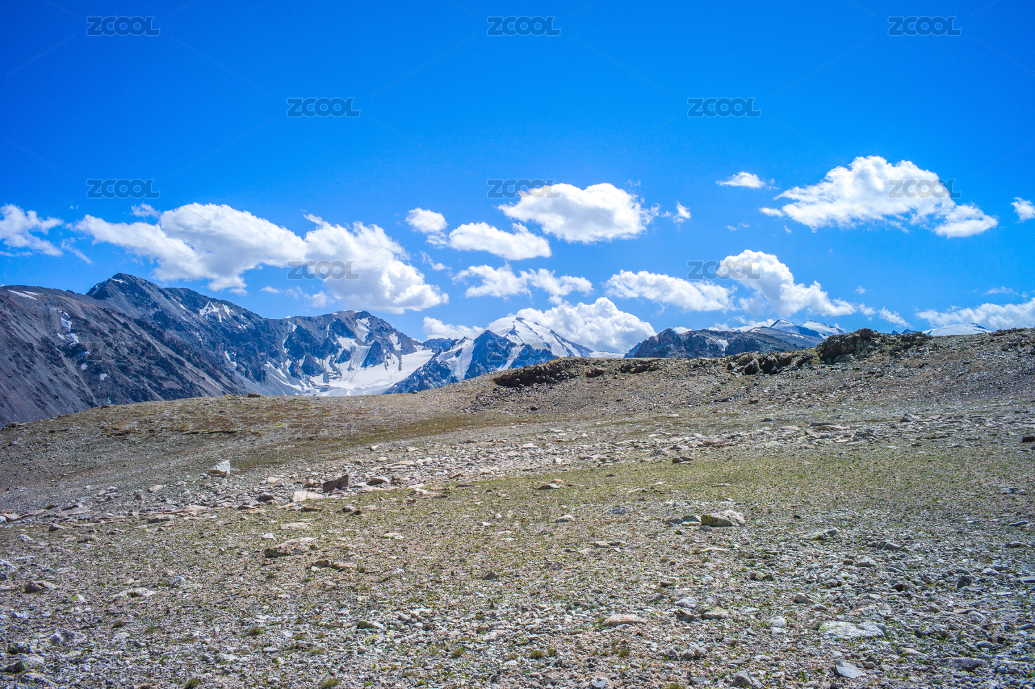 中国新疆夏季蓝天白云下高山草原G217独库公路砂石路段