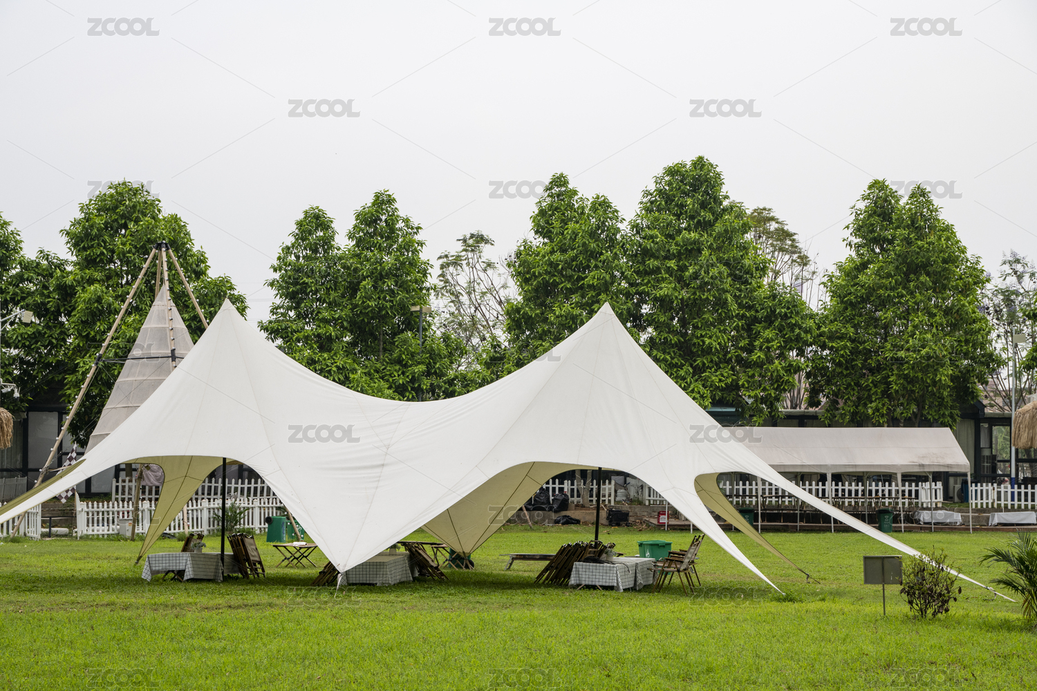 绿色草地上的一个超大的白色露营帐篷