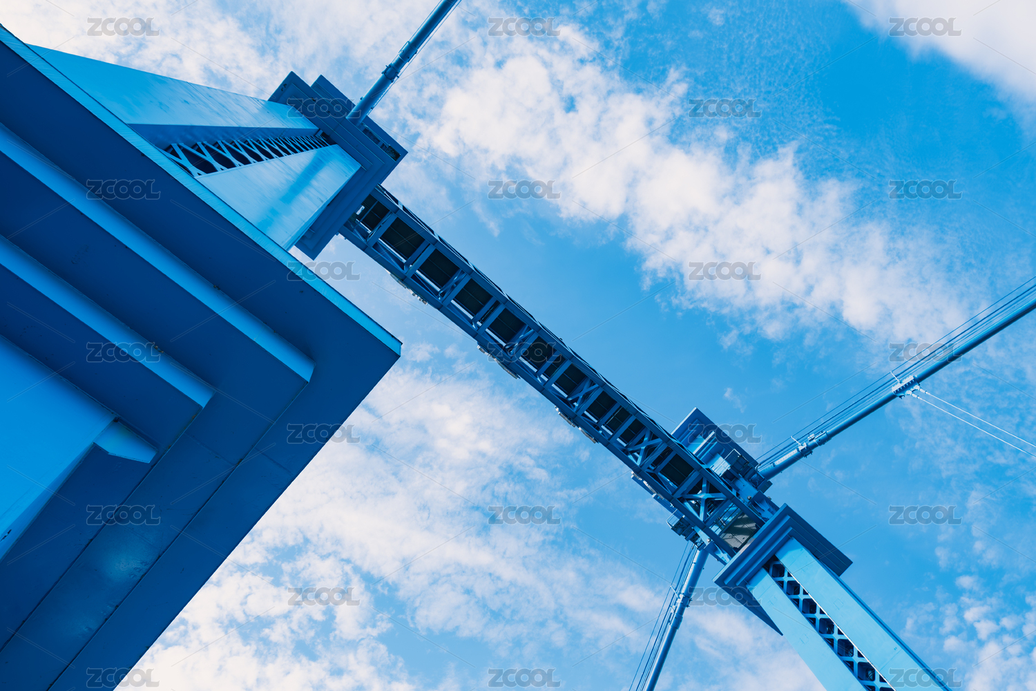 仰拍天空中的龙门式起重机