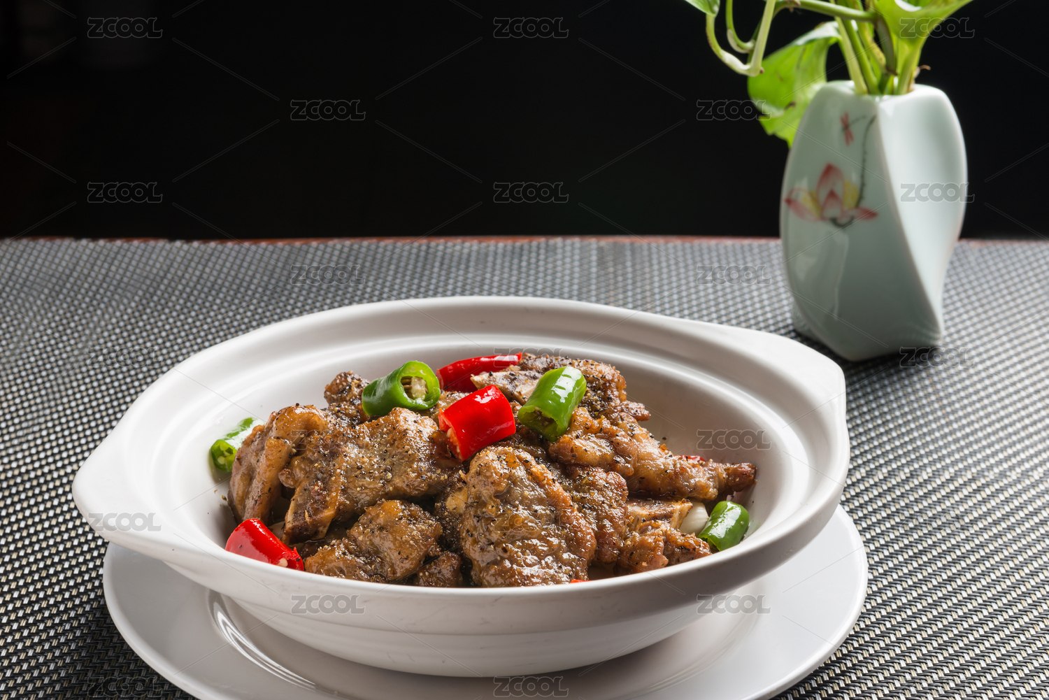 白色瓷碗装的黑胡椒猪小排摆放在黑色背景上