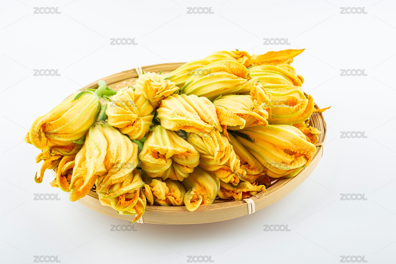 浅蓝色背景上白色瓷盘中的清蒸蒜蓉丝瓜