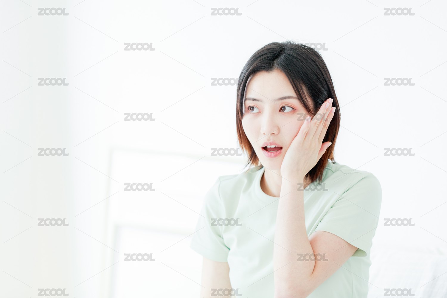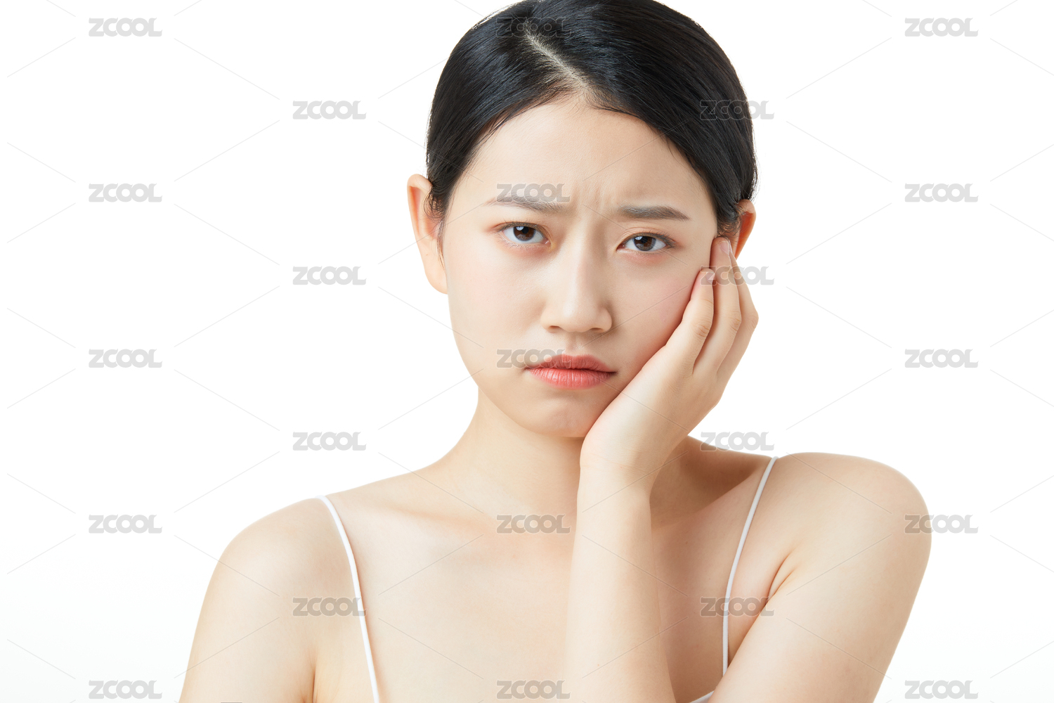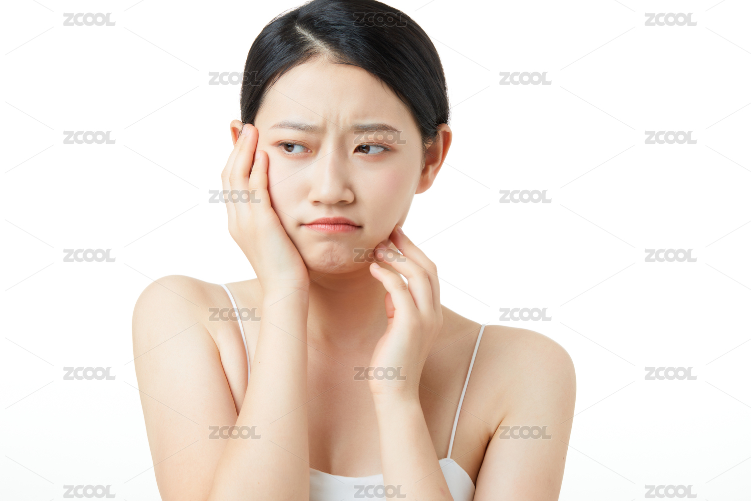 一位美丽的亚裔女孩站在纯色背景墙前用手背轻抚脸颊