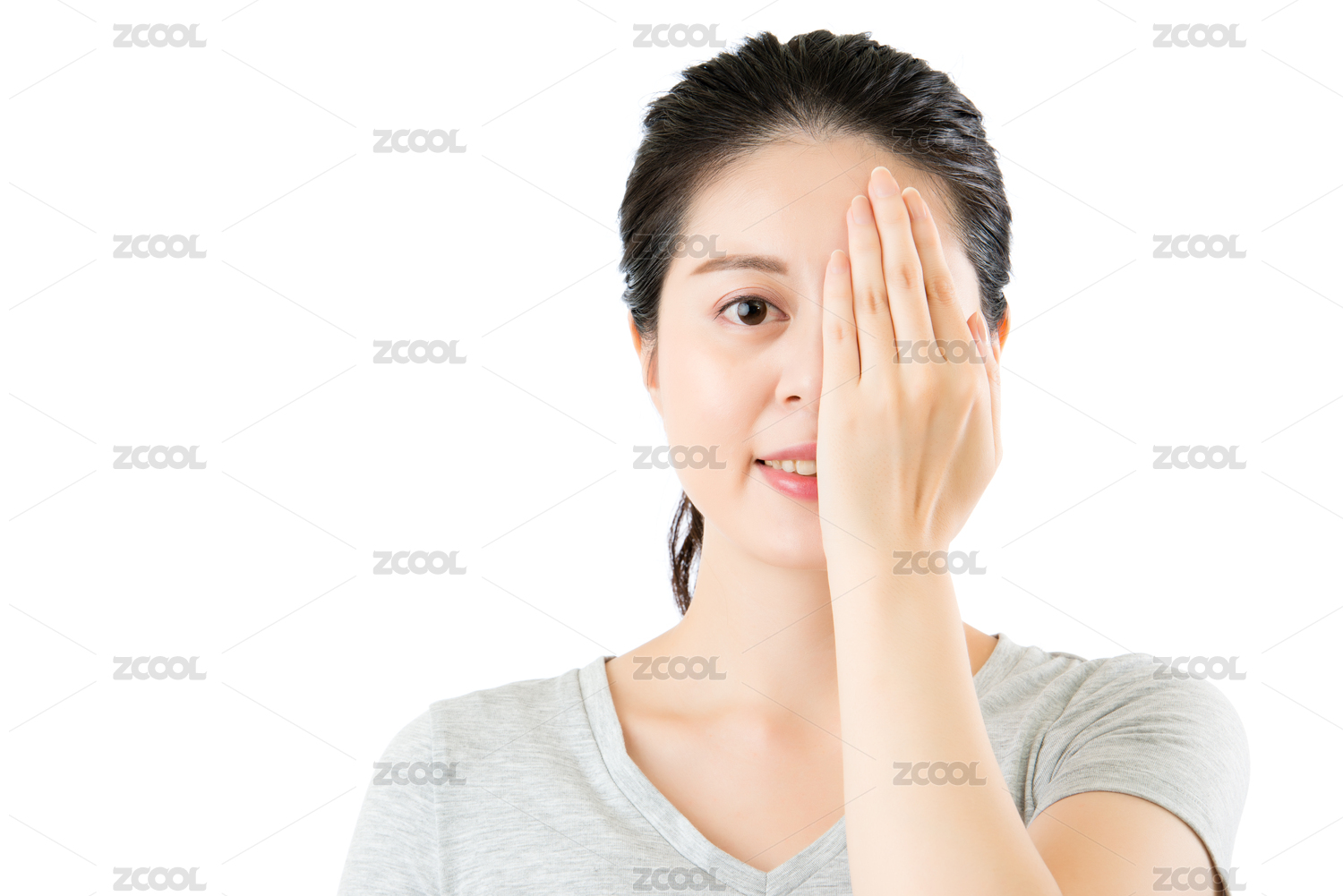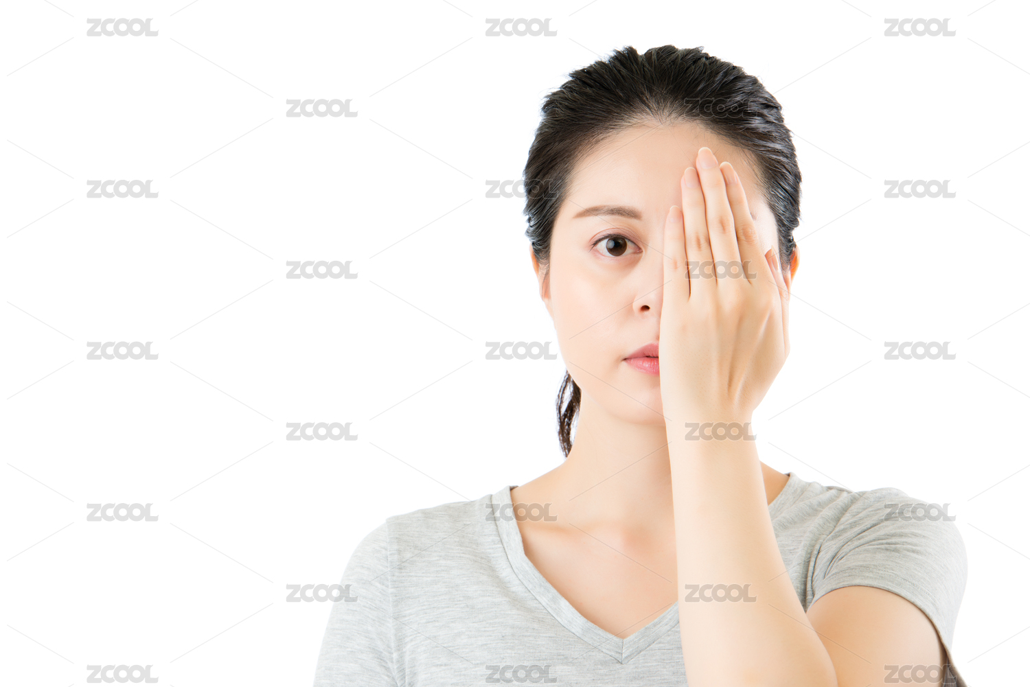 亚洲女子审查视力。关闭一个眼睛与手和字母视力测试。隔绝在白色背景。医疗和健康理念