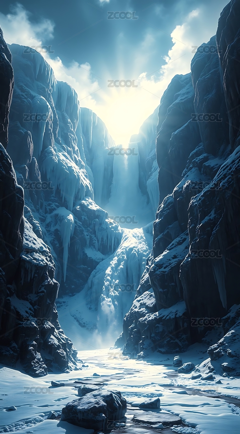 冰雪奇缘瀑布下的宁静山谷