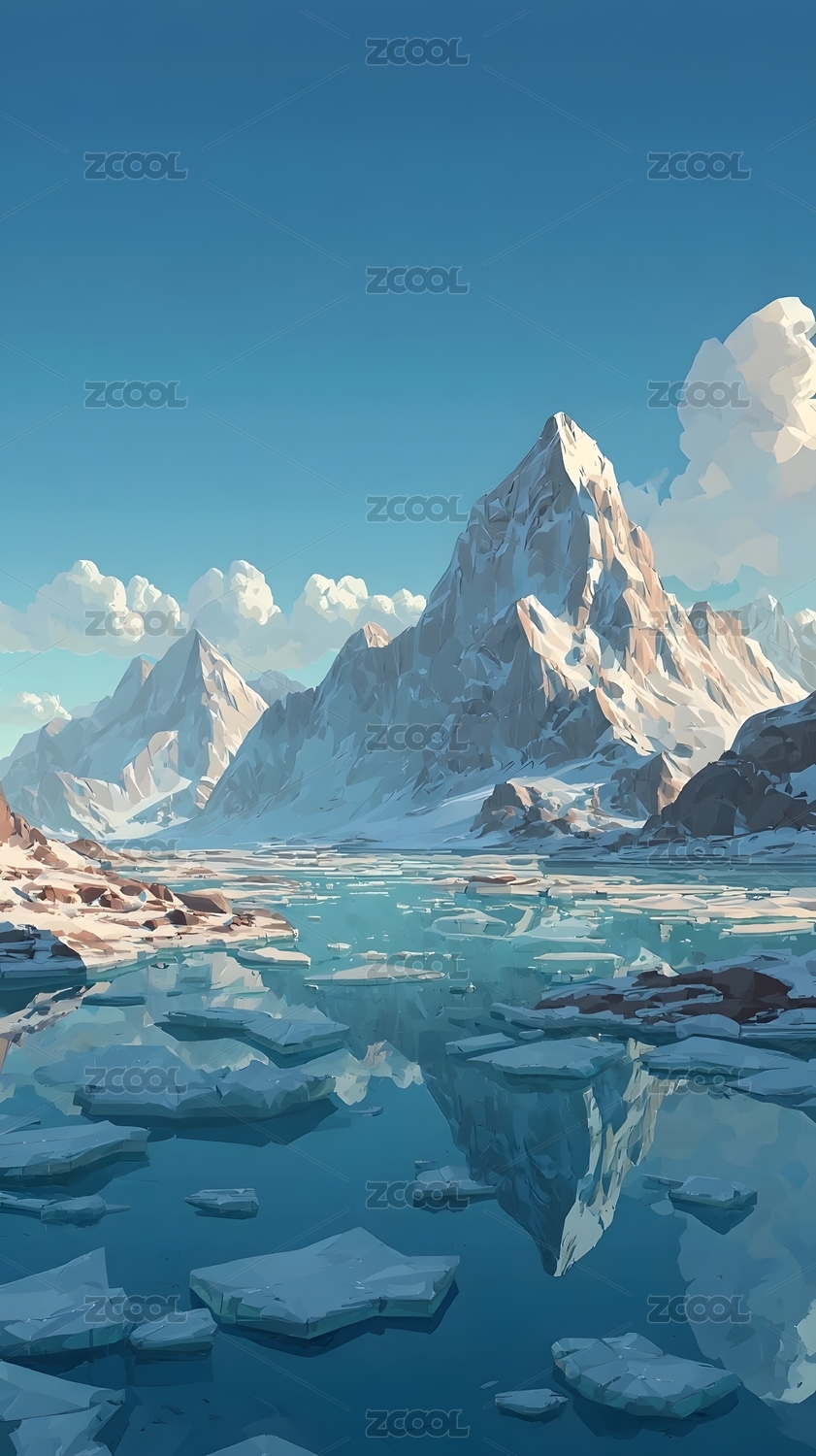 数码彩色雪山蓝天水面场景图形海报背景