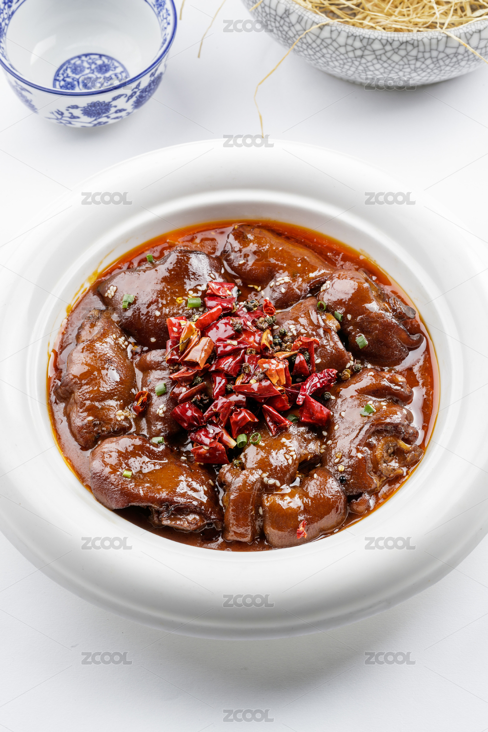 白色圆盘装的香辣猪蹄摆放在白色背景上