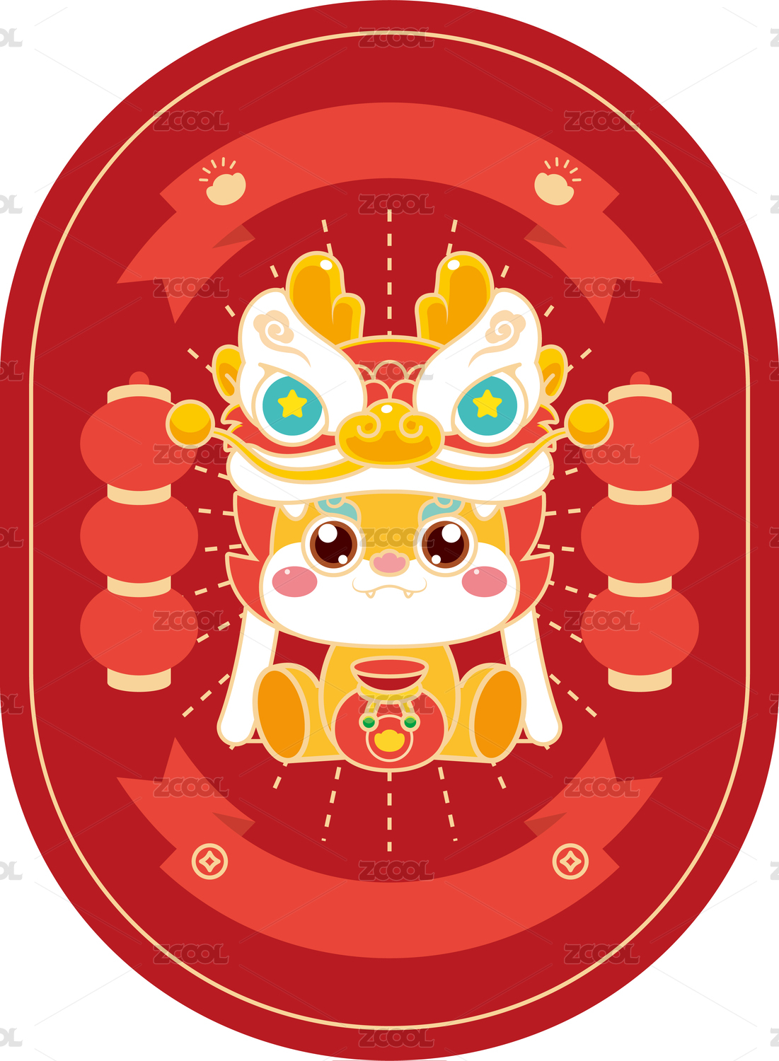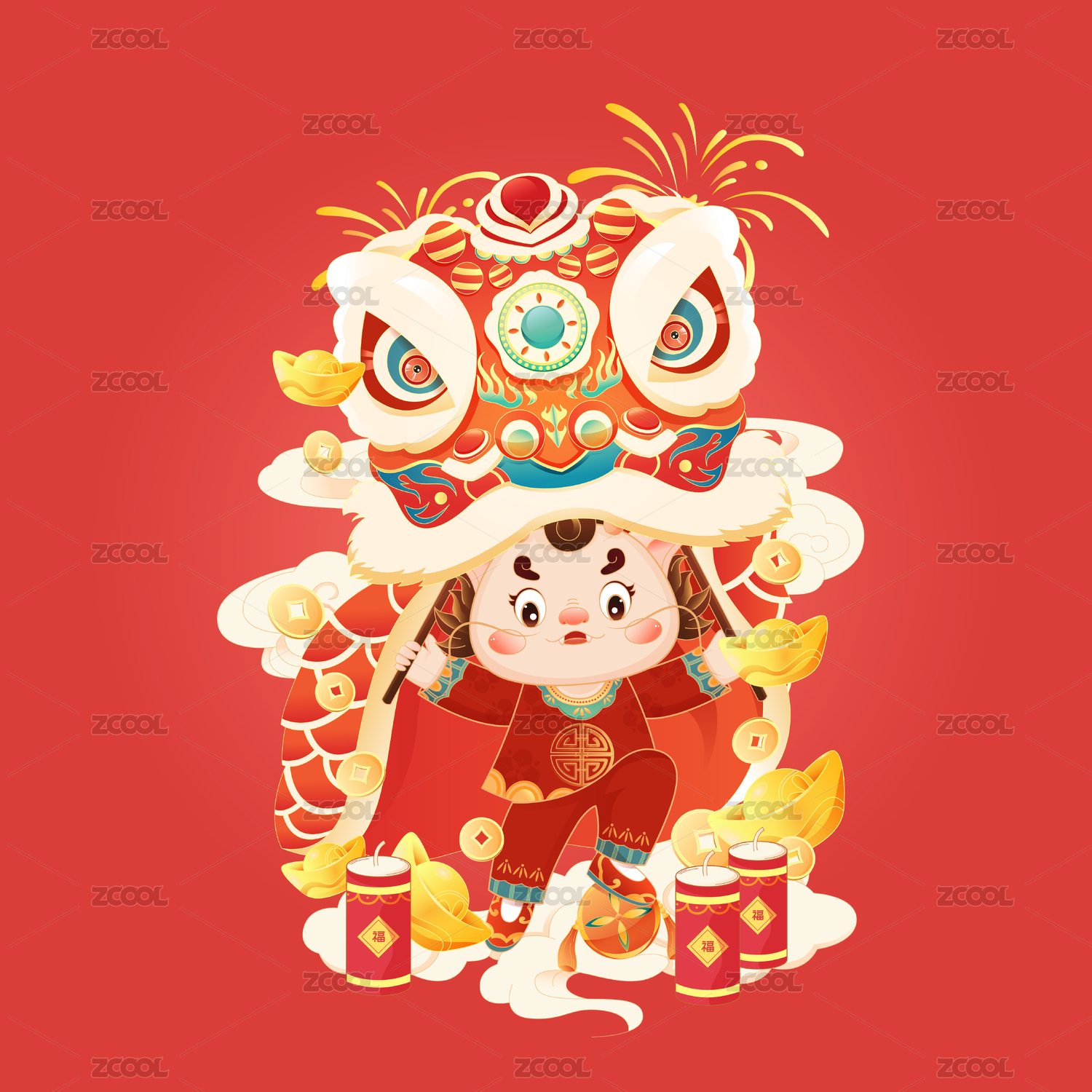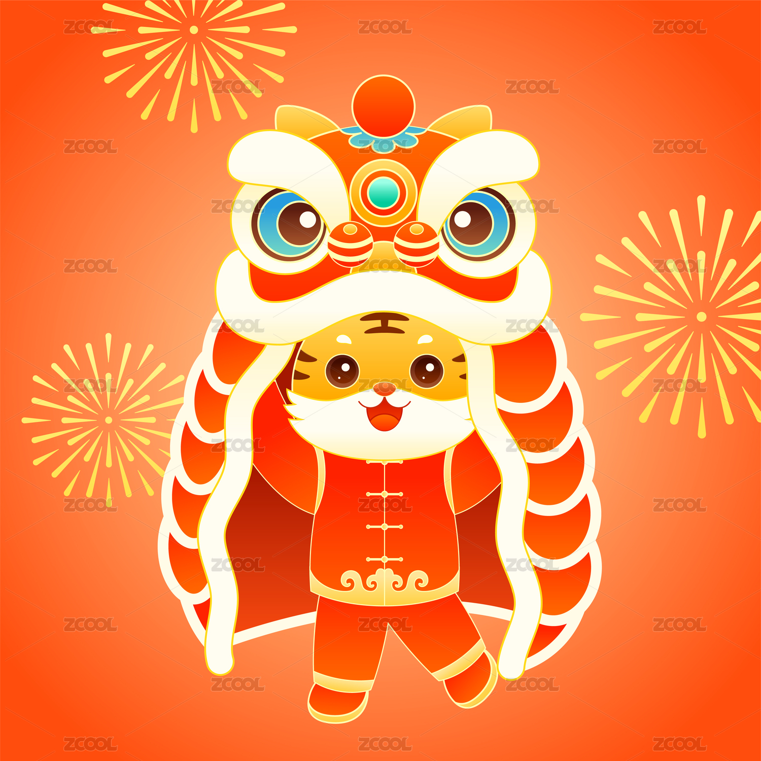 新春虎年舞狮祝福新年吉祥如意国潮矢量插画