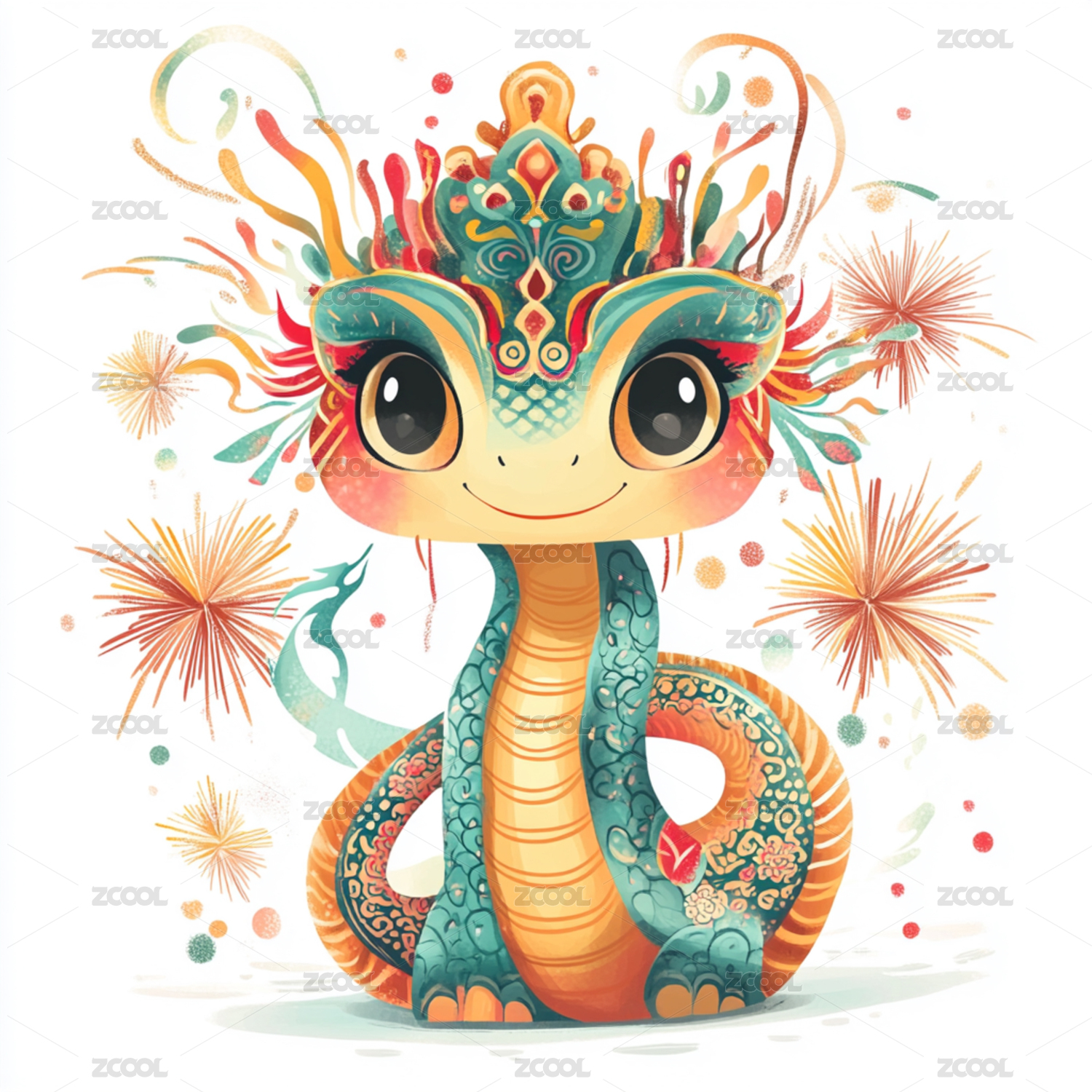 节日烟花下的可爱小蛇插画