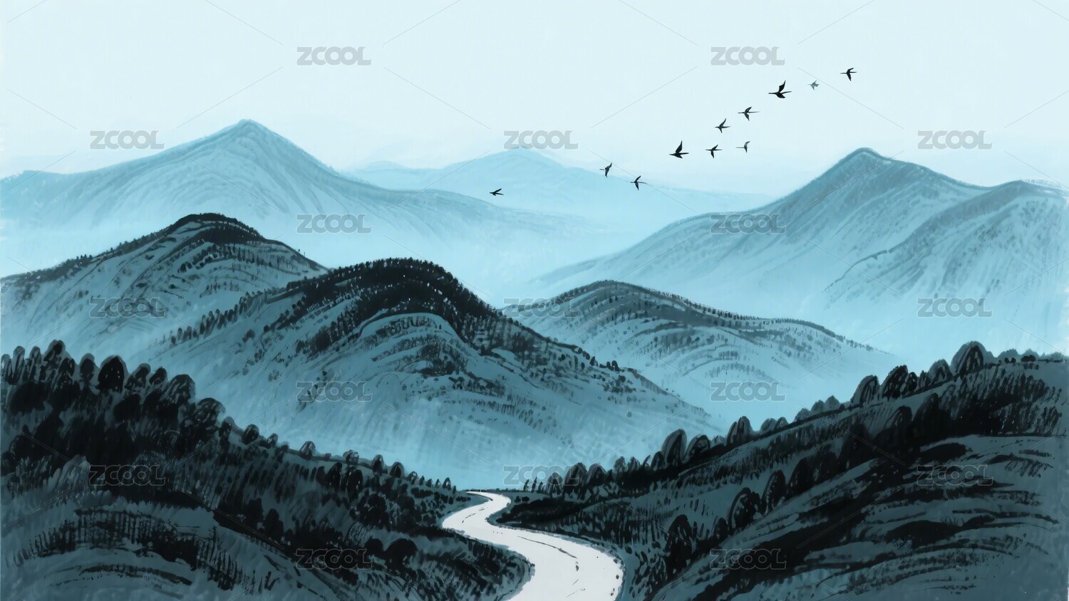 蓝色水墨山水古风插画