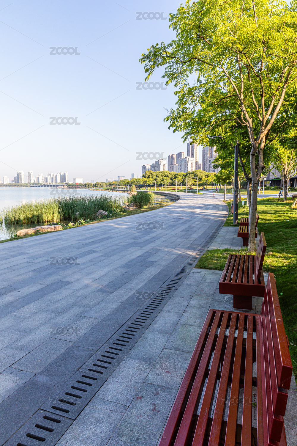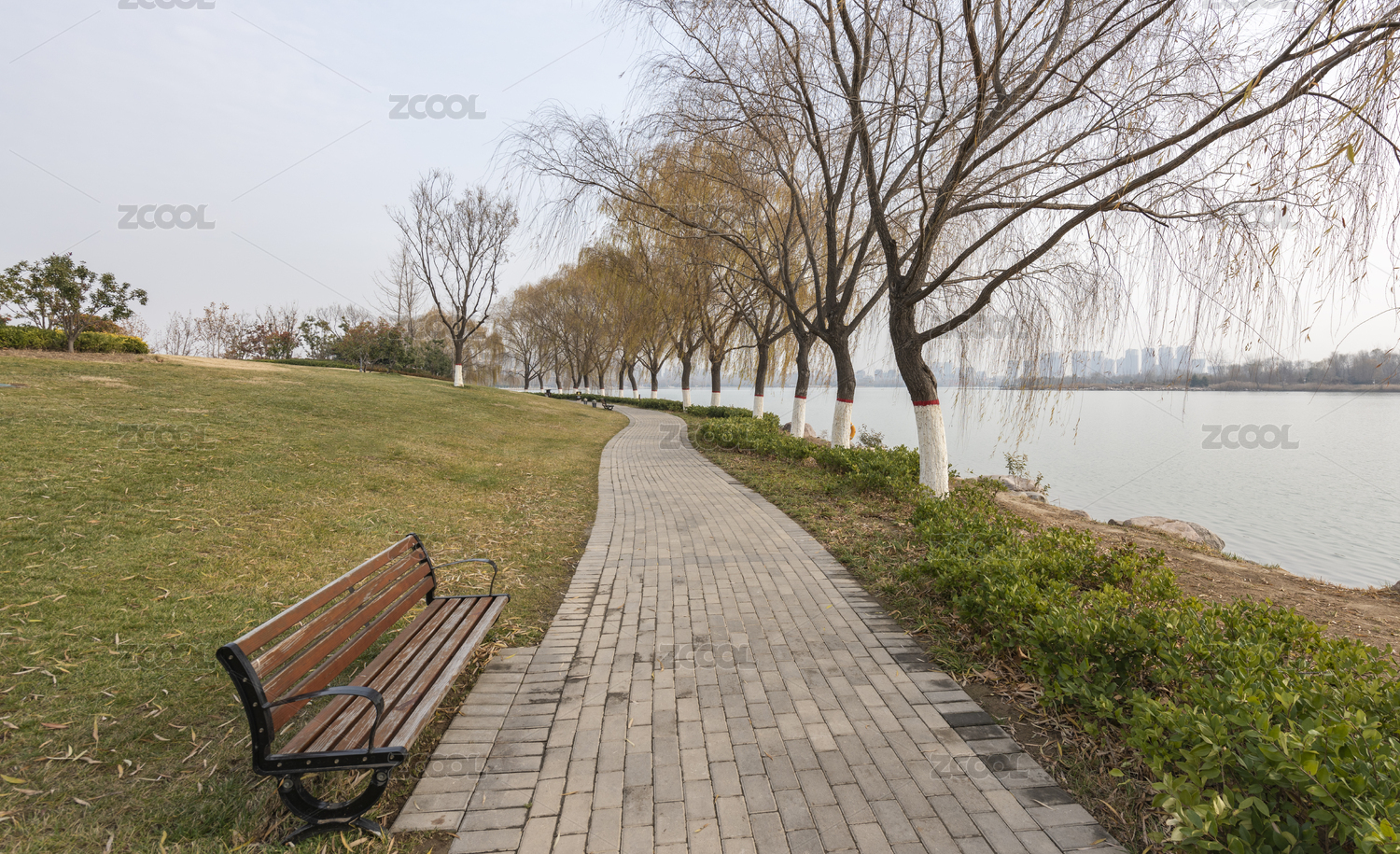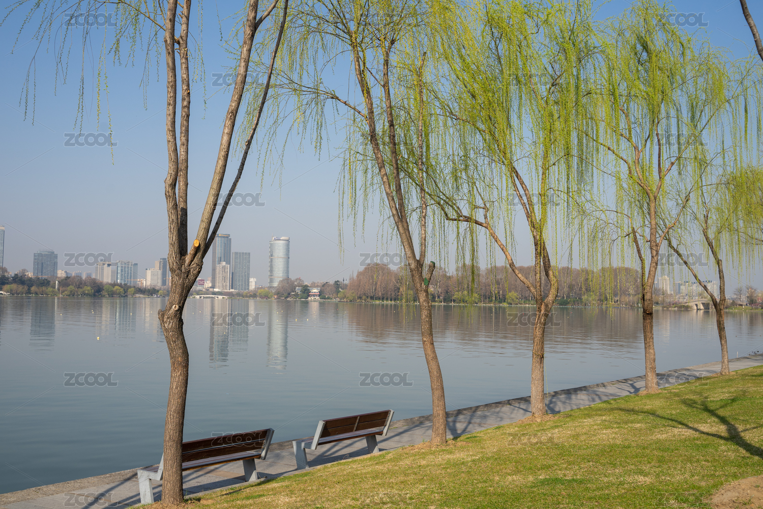春天中国南京玄武湖岸边的垂柳与休闲椅