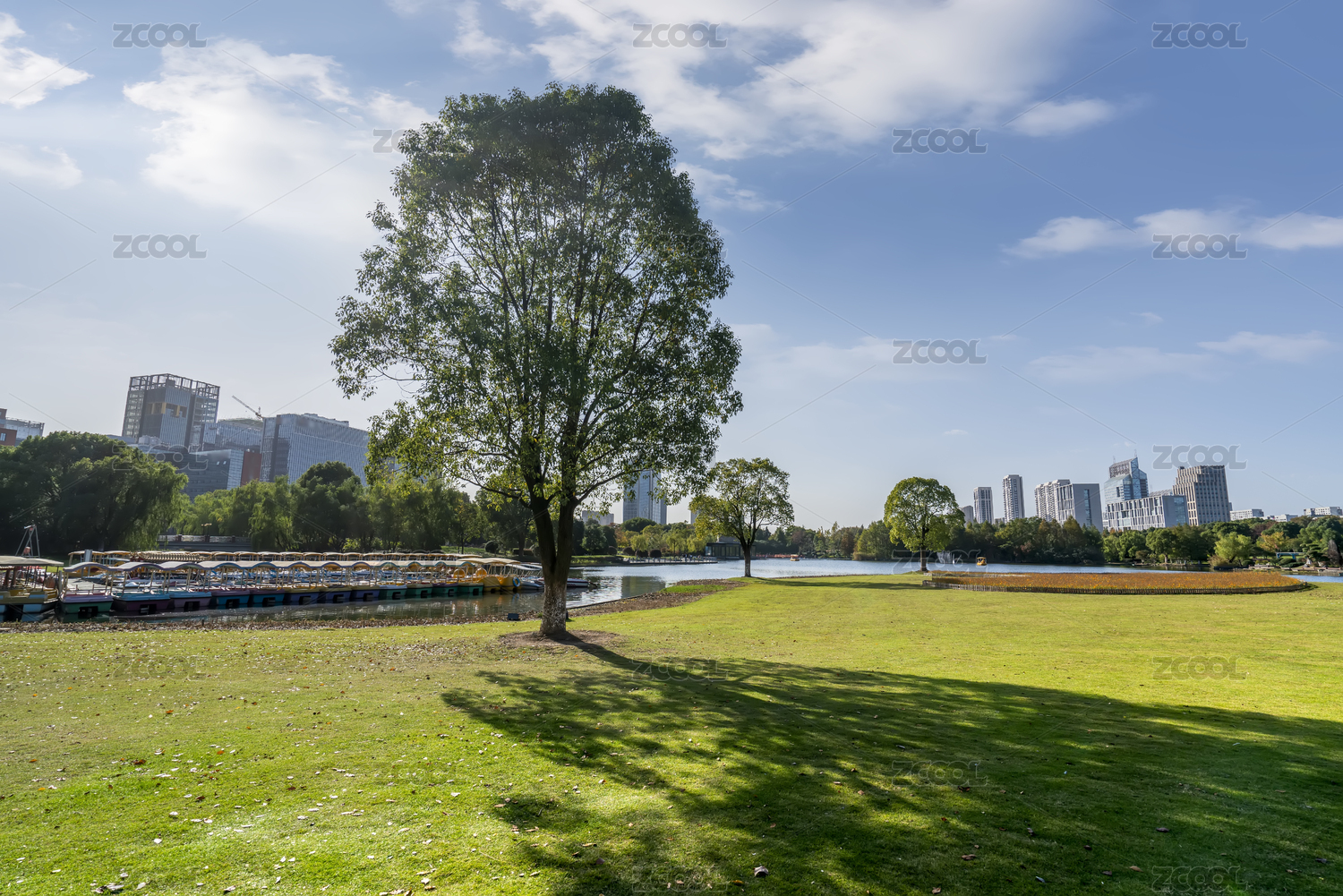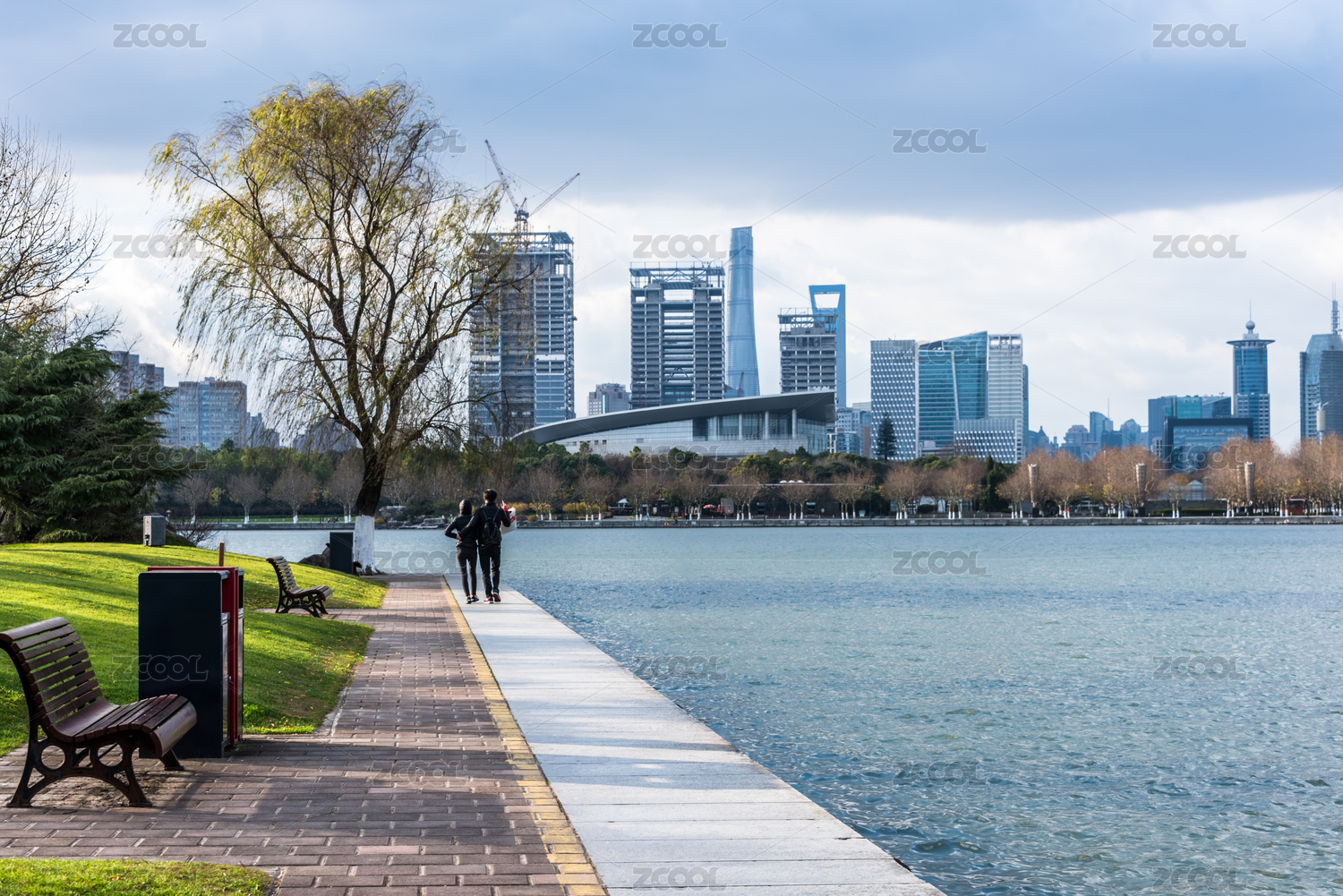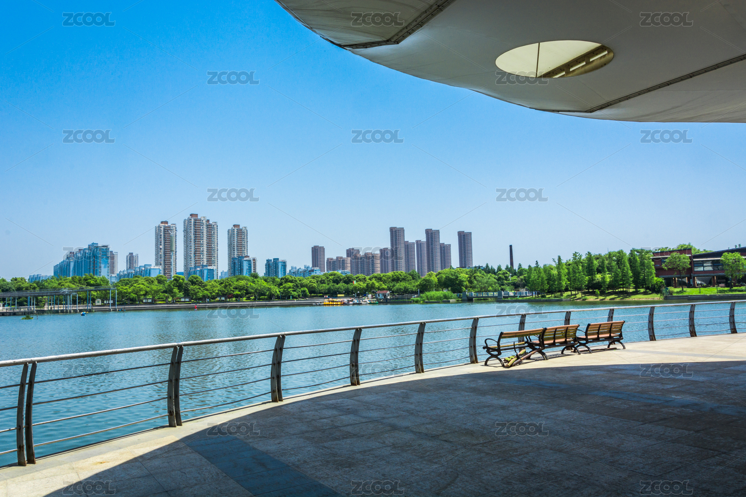 春天中国南京玄武湖岸边的垂柳与休闲椅