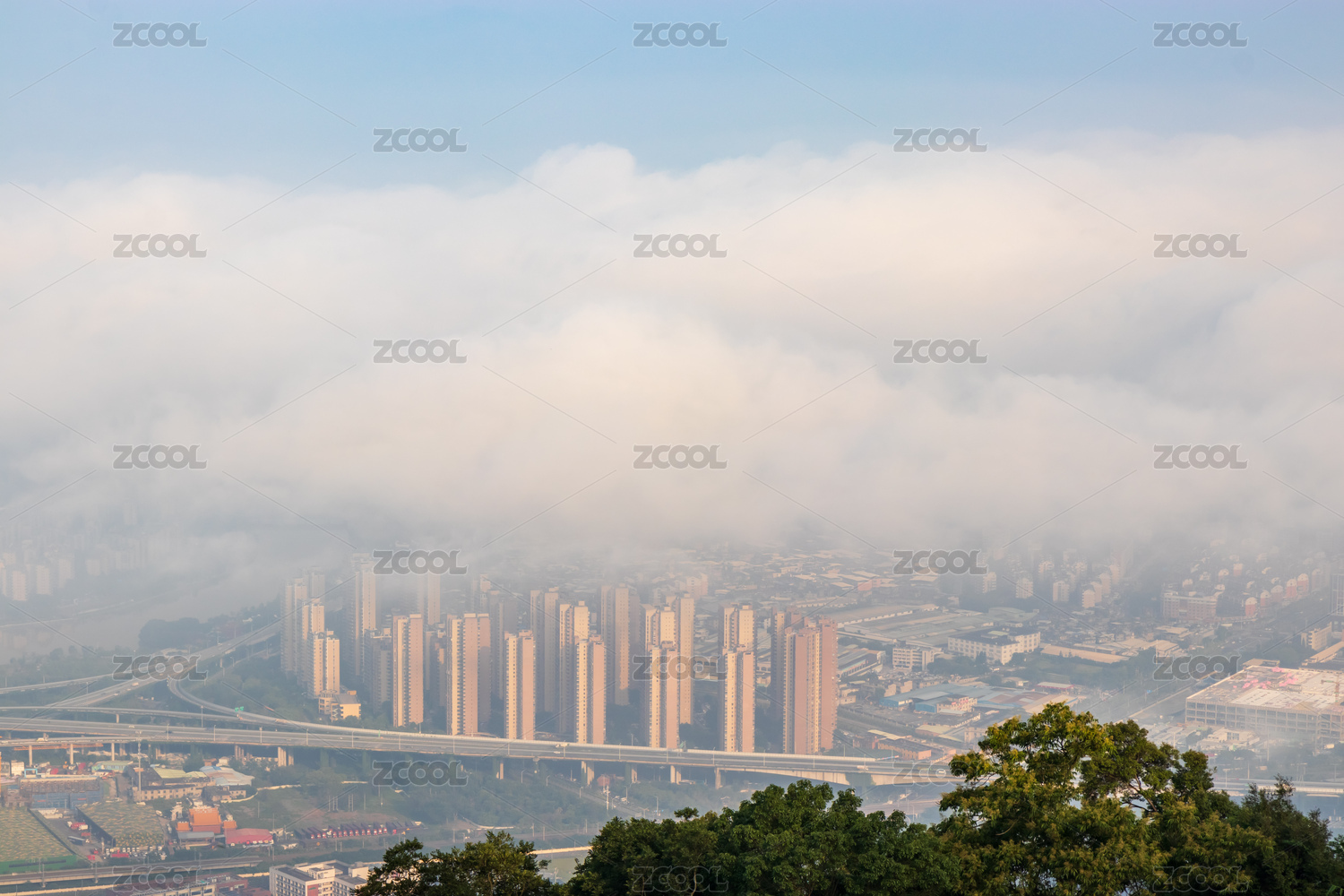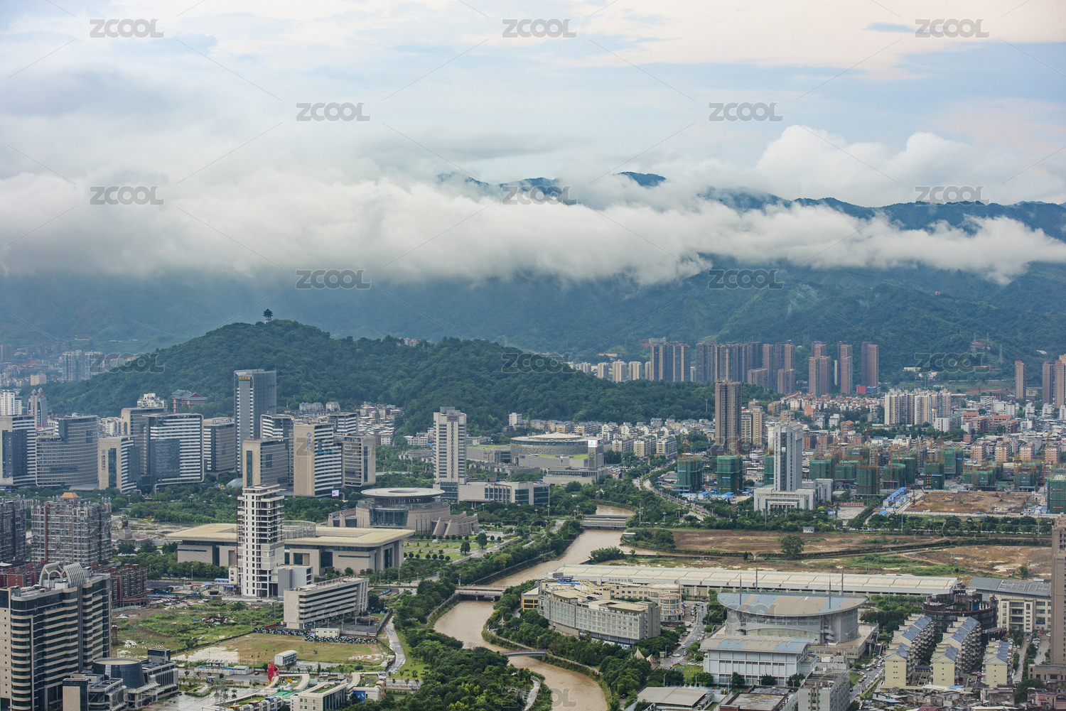 雨后远处山峦云雾缭绕的福建龙岩城区一角