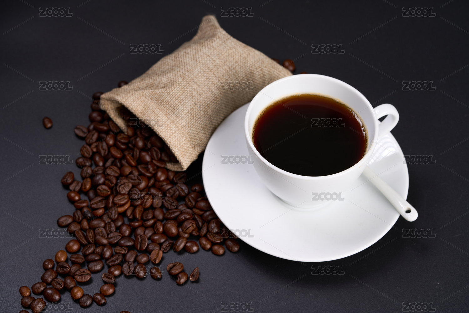 一杯咖啡和咖啡豆摆放在桌面上特写