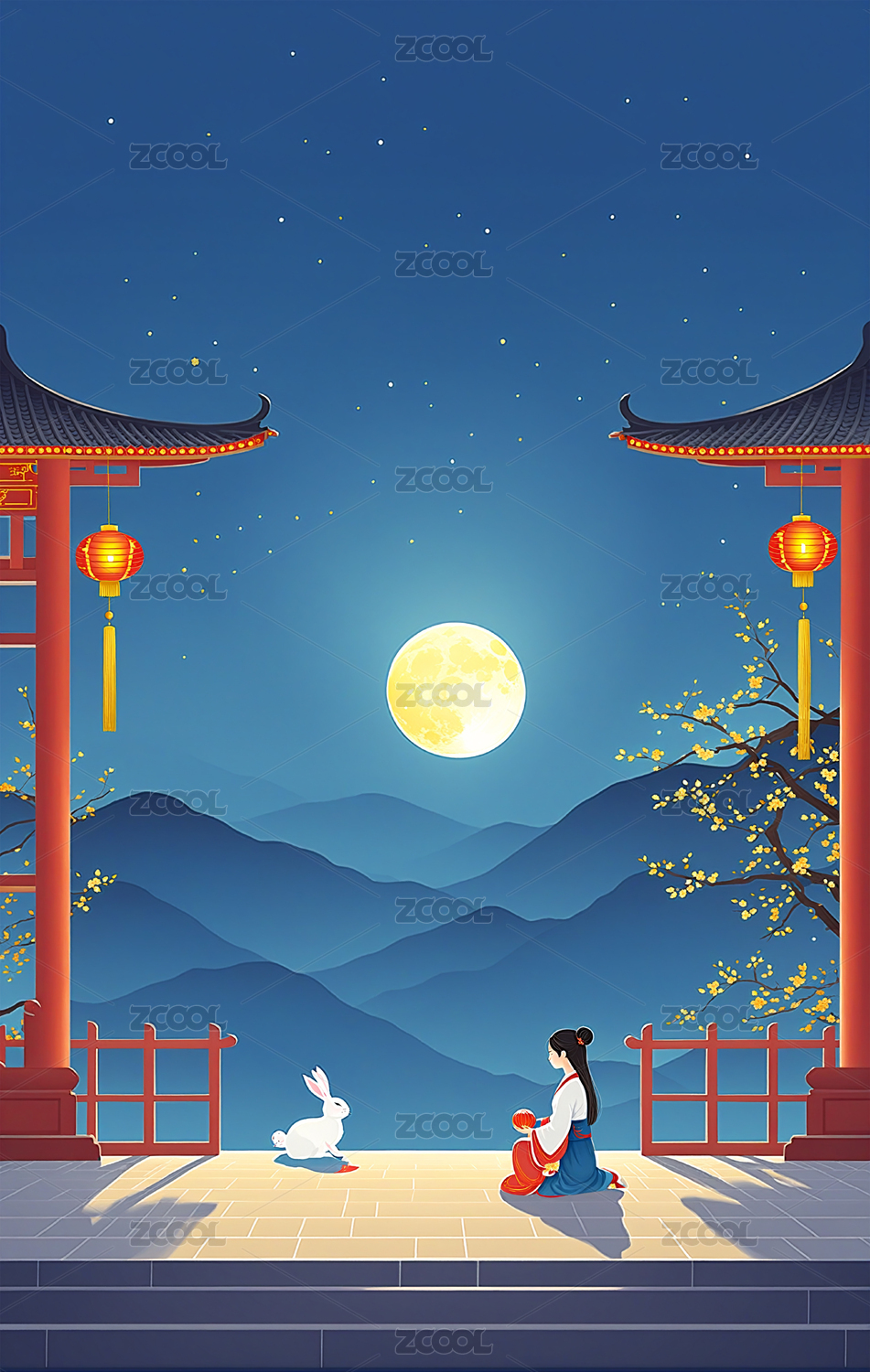 中秋玉兔嫦娥月圆古风ai扁平插画
