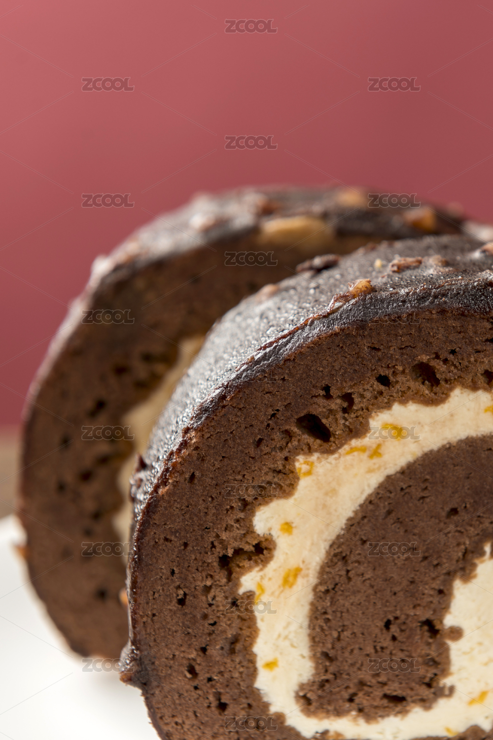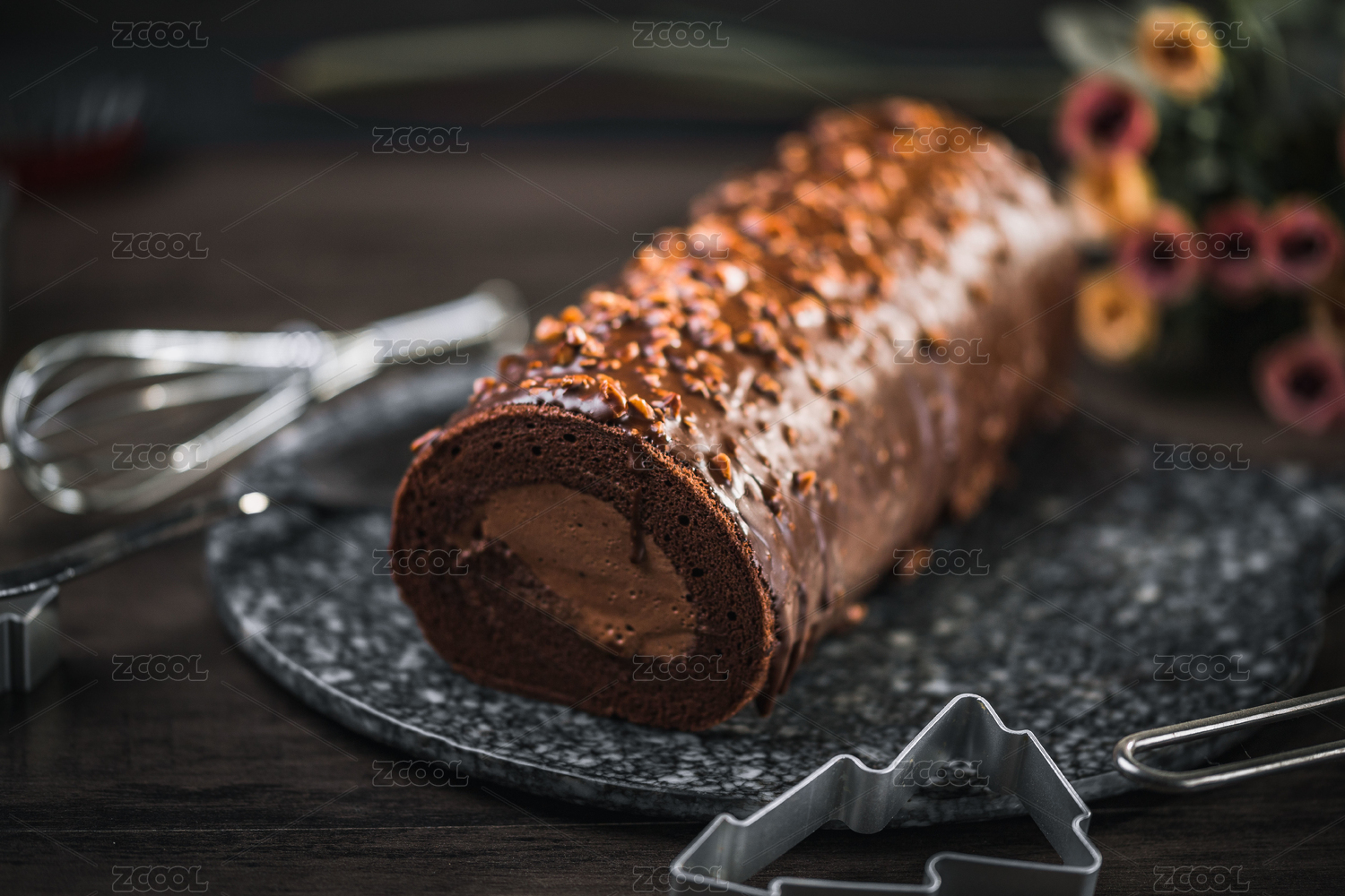 巧克力瑞士卷蛋糕摆放在桌面上特写