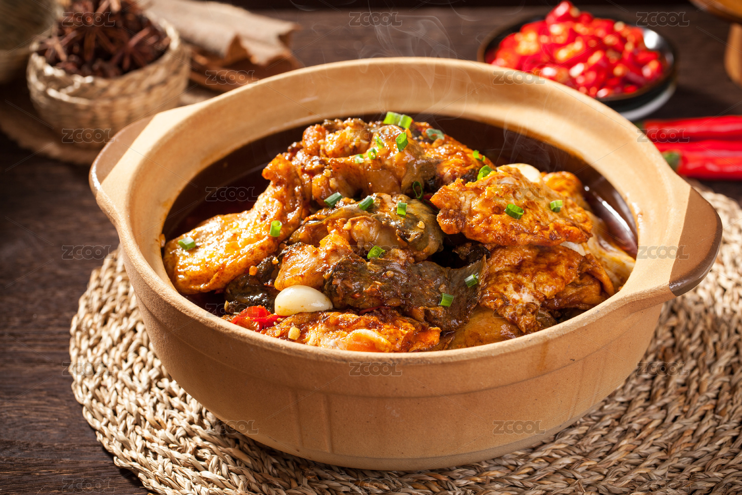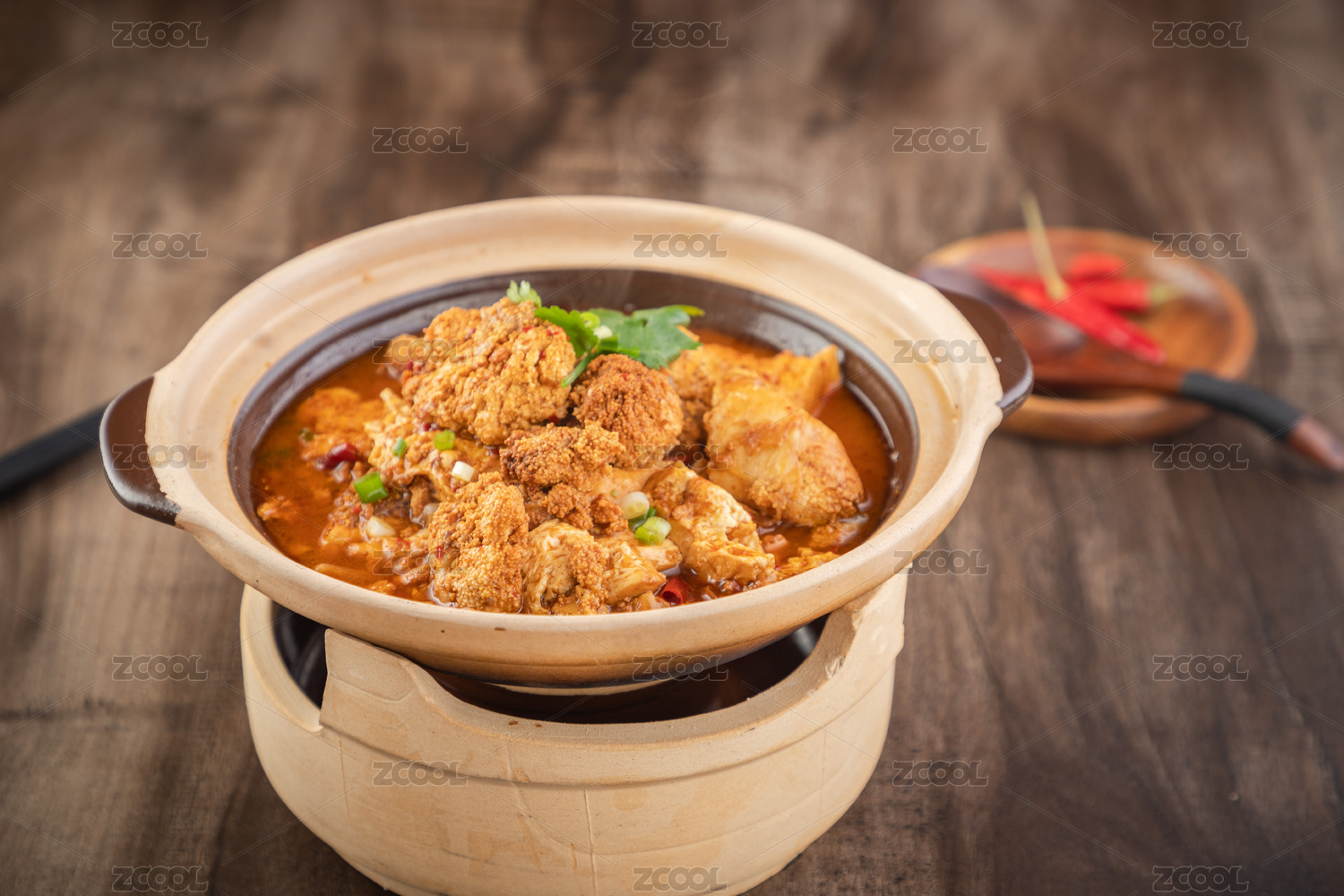 棕色木纹桌上放着一份麻辣豆泡香锅