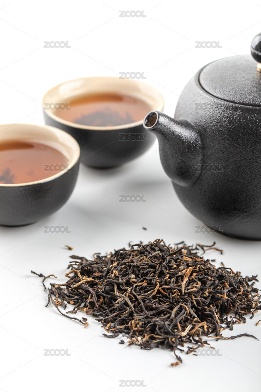 白底上放着的茶叶和茶具