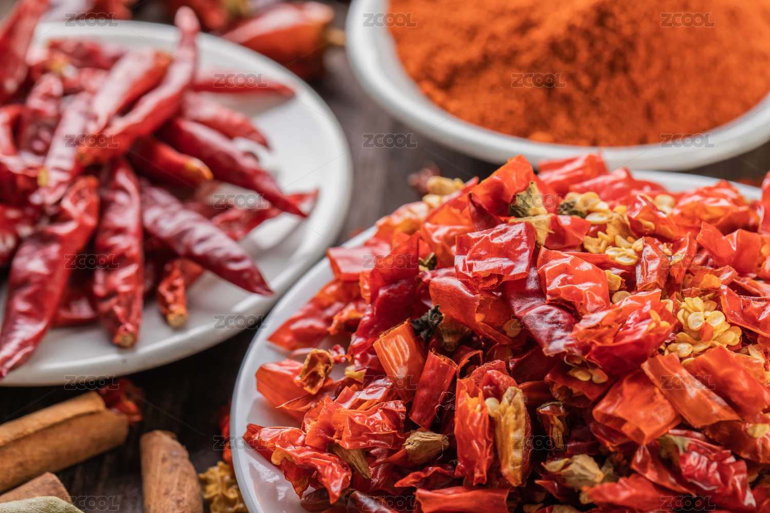 辣椒粉和干辣椒放在原木木纹桌面上