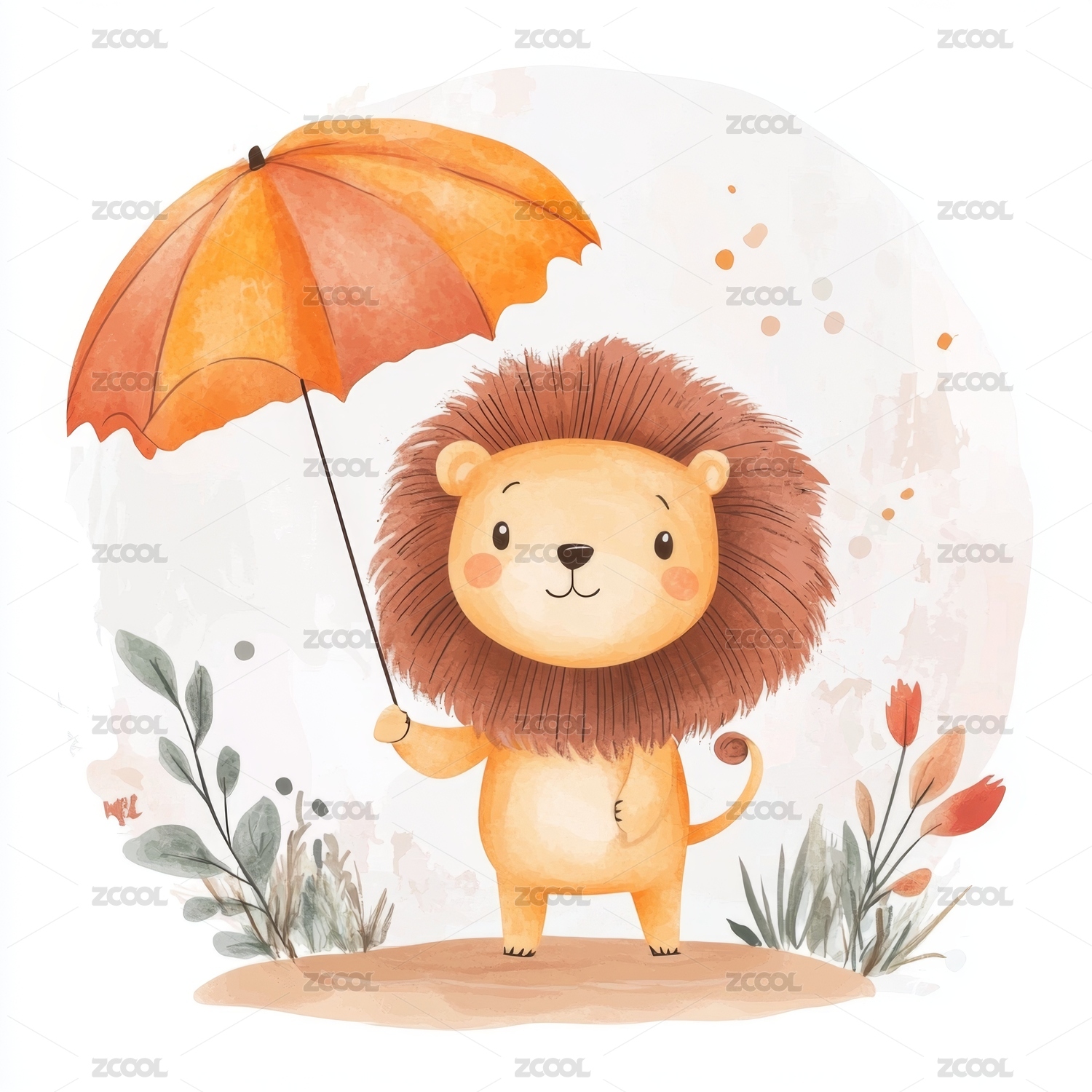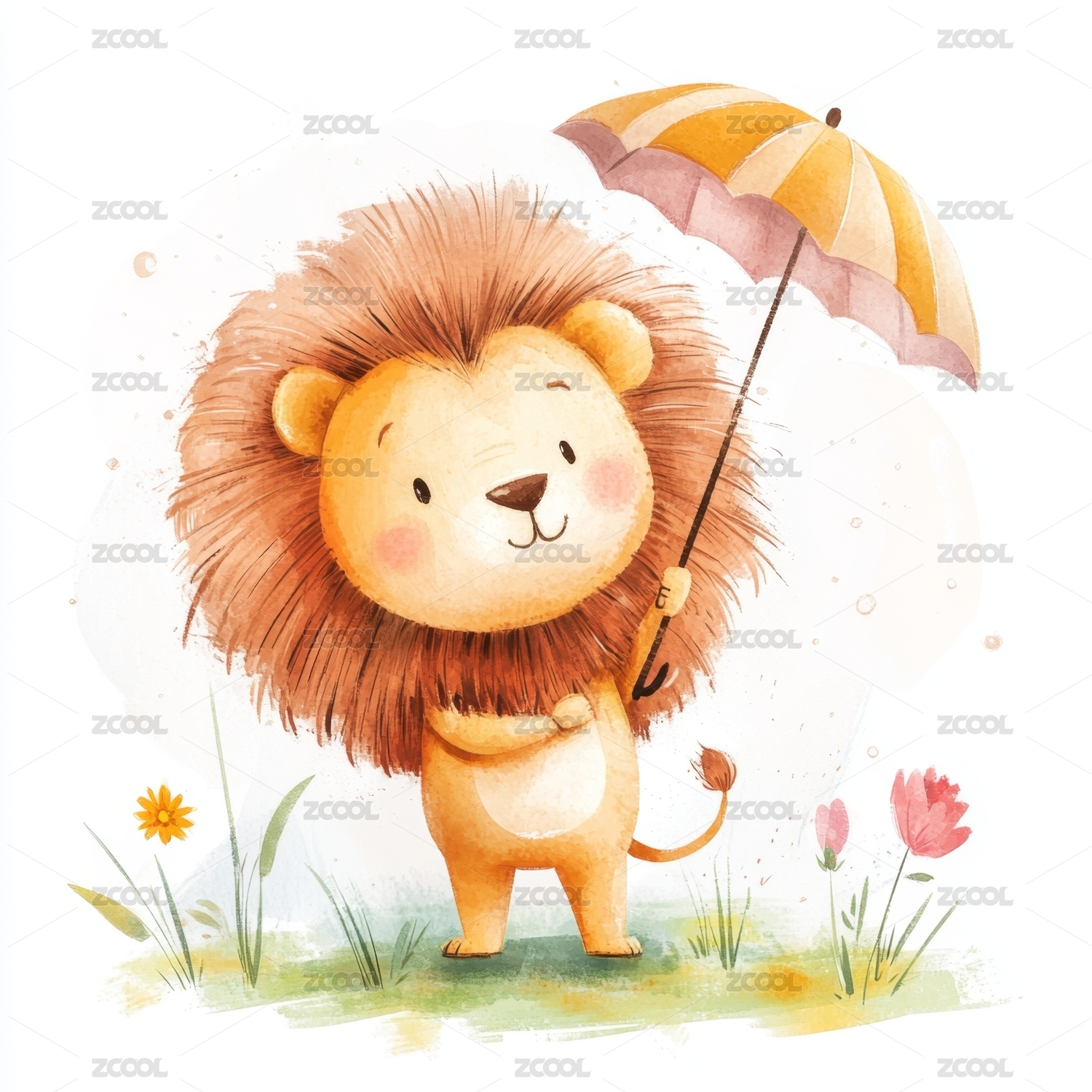可爱小狮子撑伞儿童卡通插画