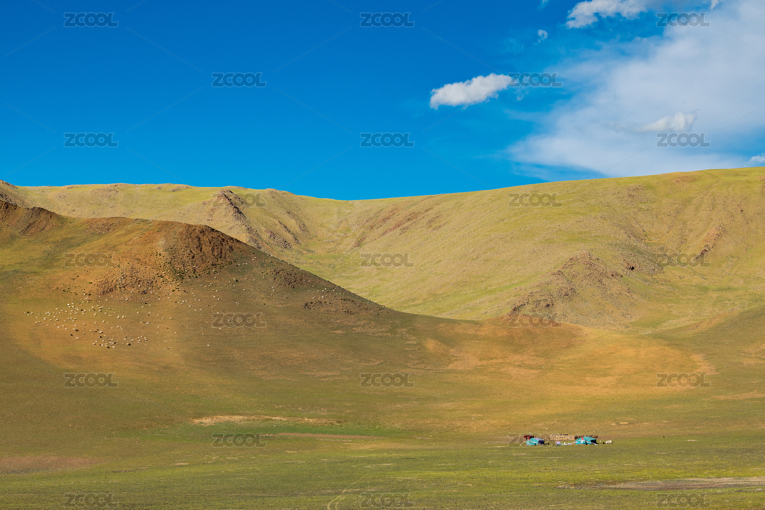 蓝天白云下的草原山脉和高原牧场,中国西藏