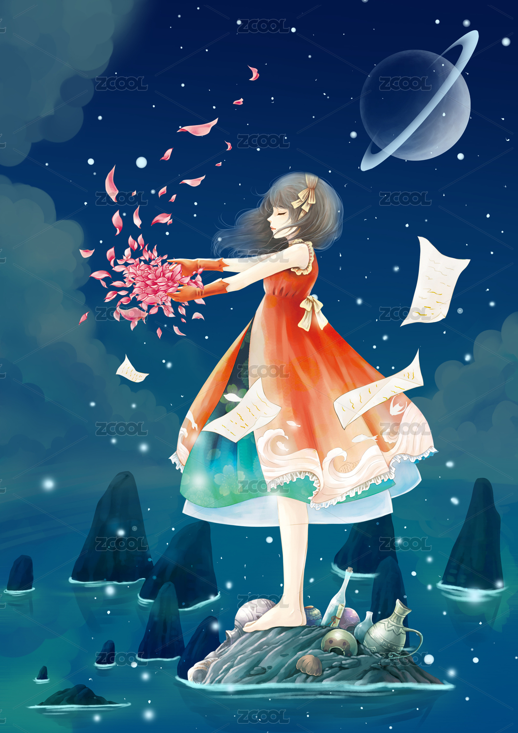 岛屿丛中的花瓣女孩
