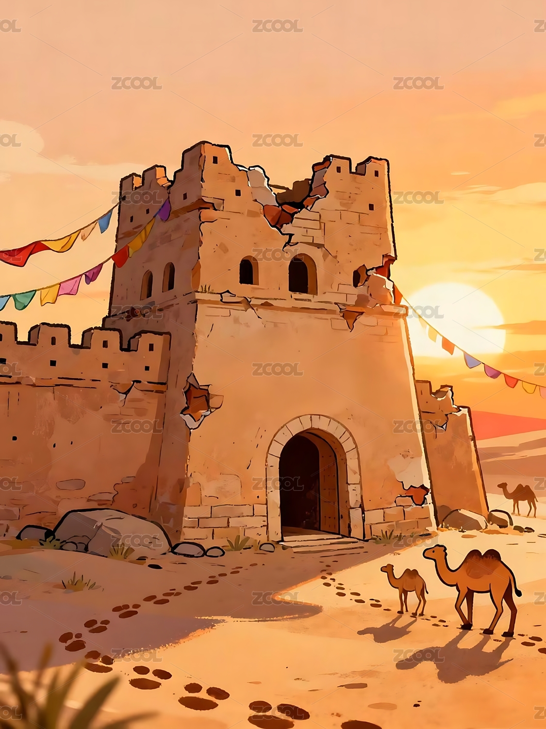 塔克拉玛干沙漠热门城市旅游景点插画明信片