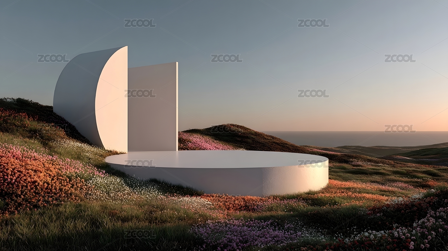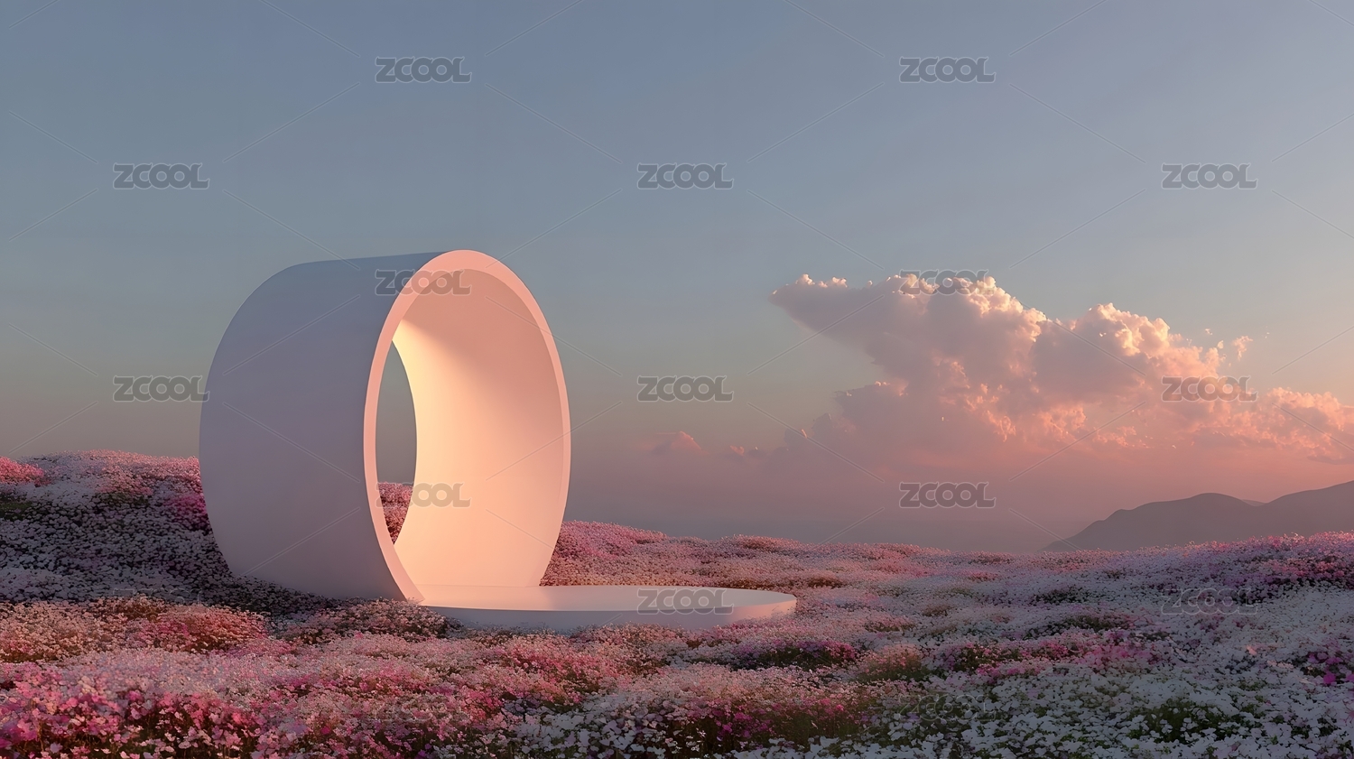 日落花海中的白色圆环