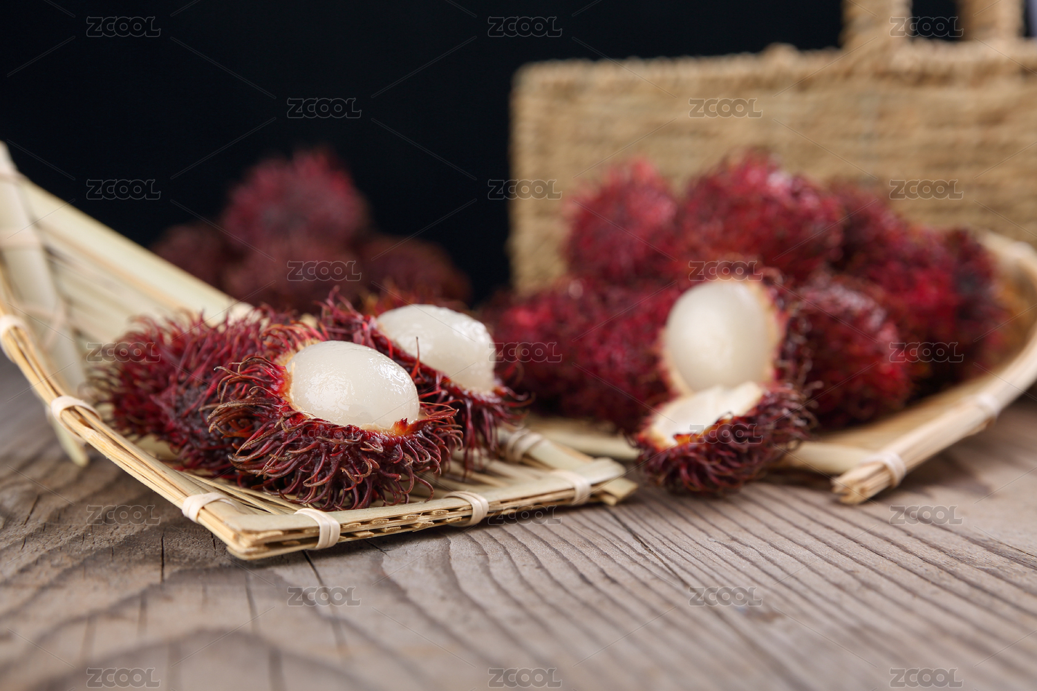 装有毛丹的竹编簸箕放在粉色背景纸上