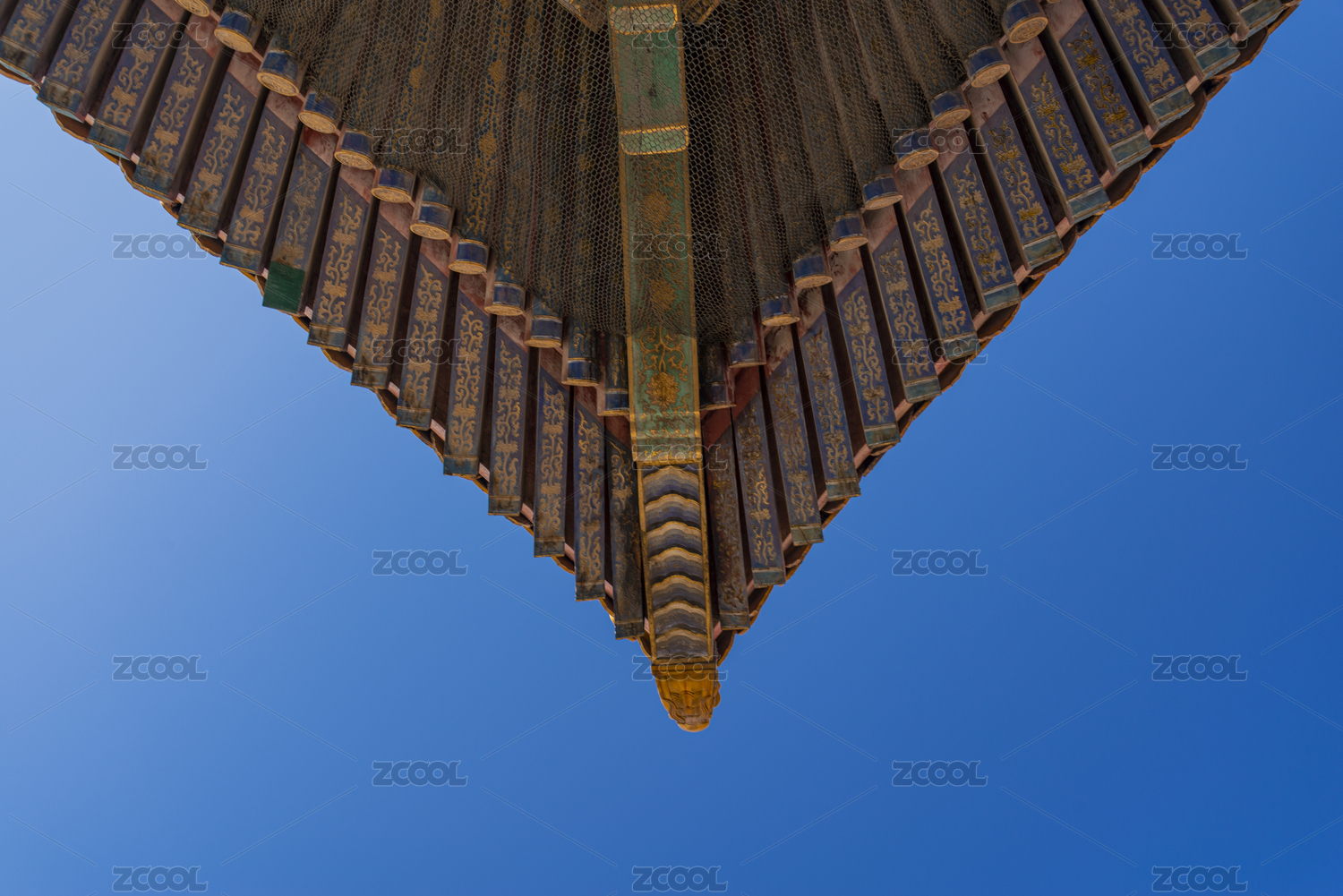 蓝天下阳光中的故宫东雁翅楼屋顶房檐特写