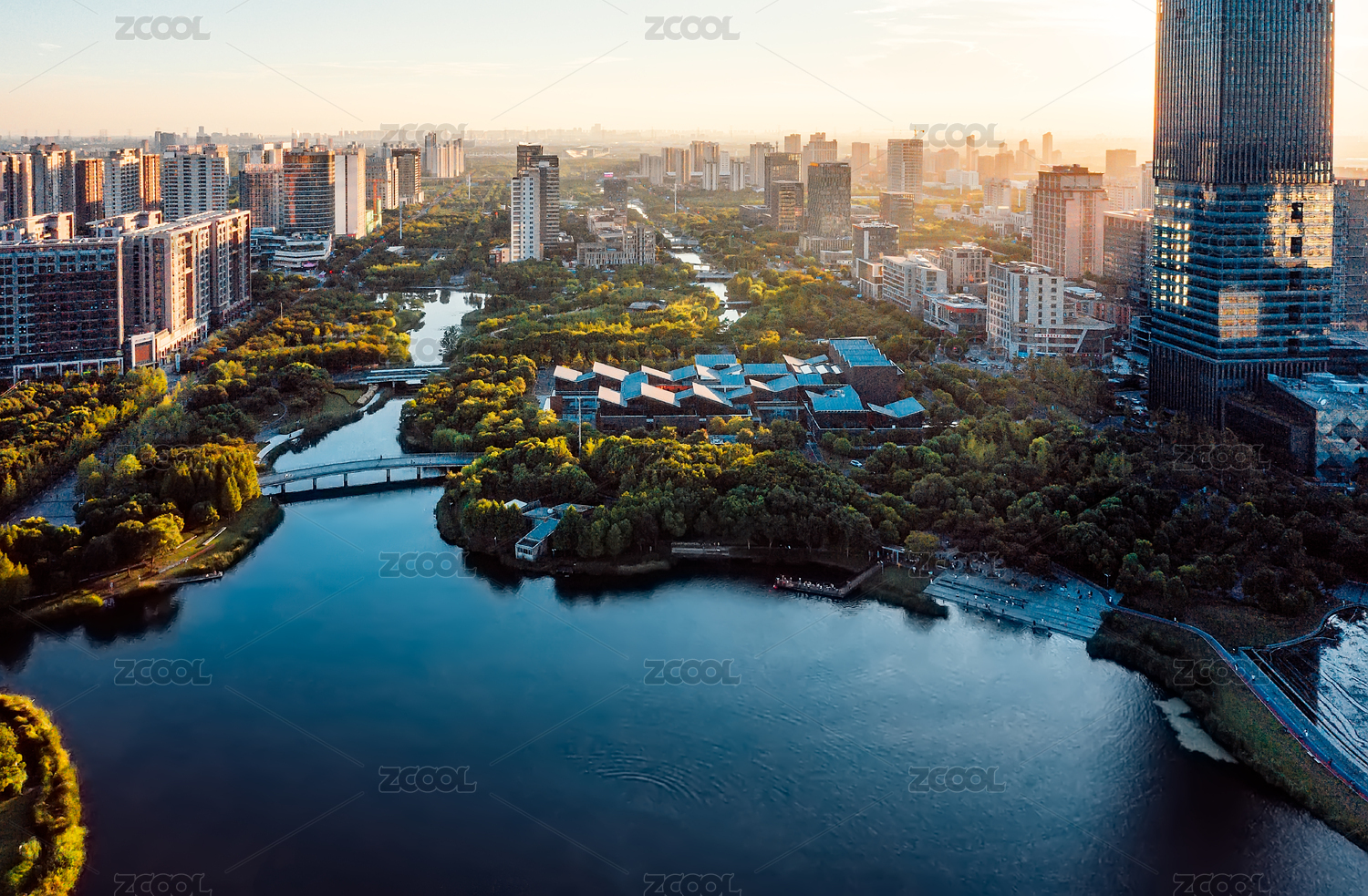 航拍江苏常州钟楼区青枫公园与区政府办公楼