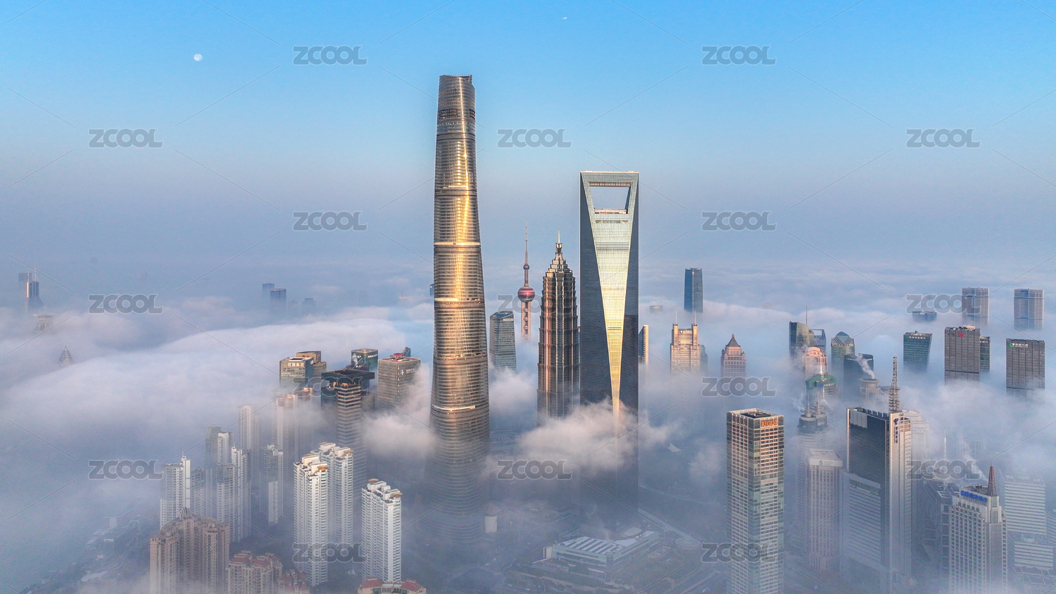中国上海浦东陆家嘴地标建筑群平流雾航拍