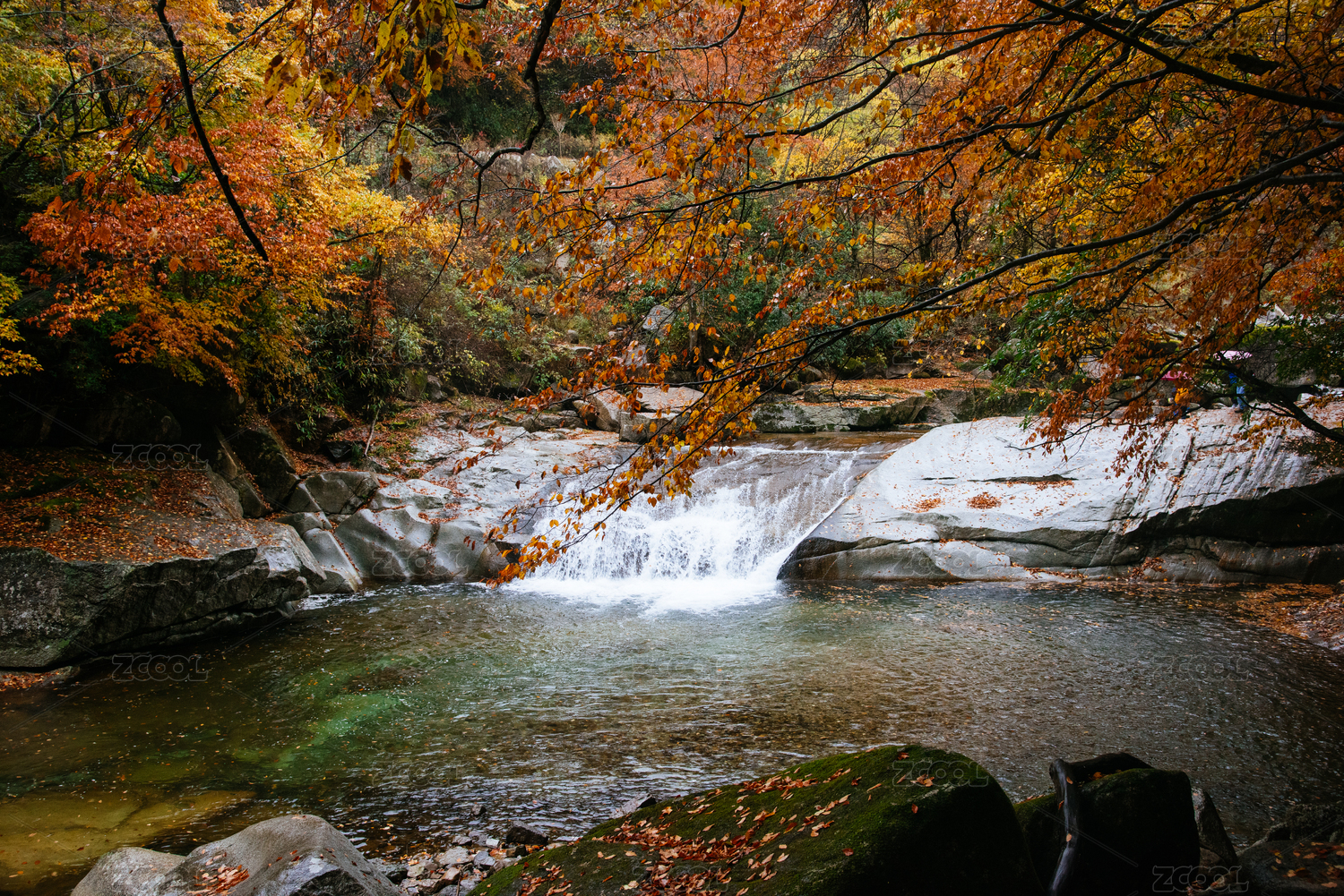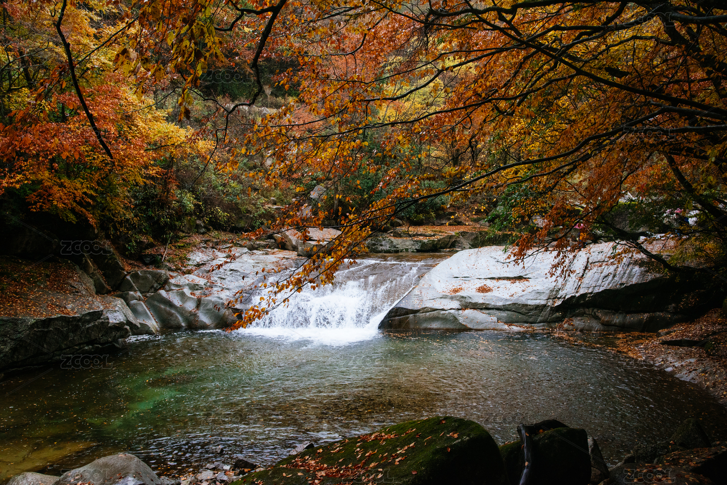 中国四川巴中南江县光雾山秋季的红叶溪流