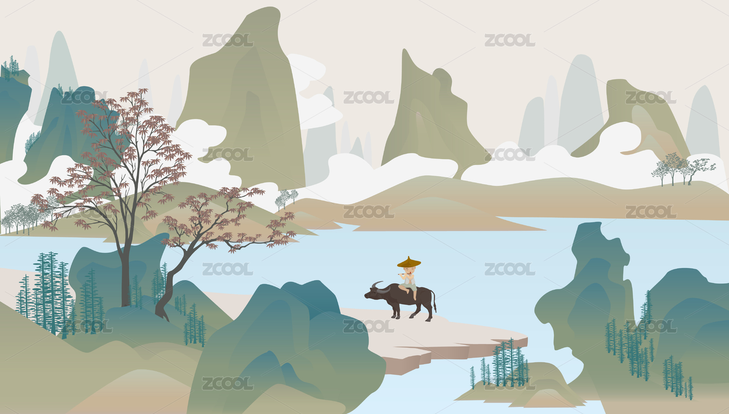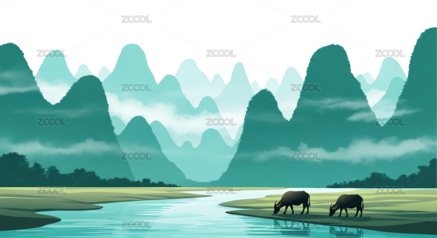 国画,中国画,山水画,山水,青绿山水,矢量,牧童,骑牛,黑牛,牧童吹笛