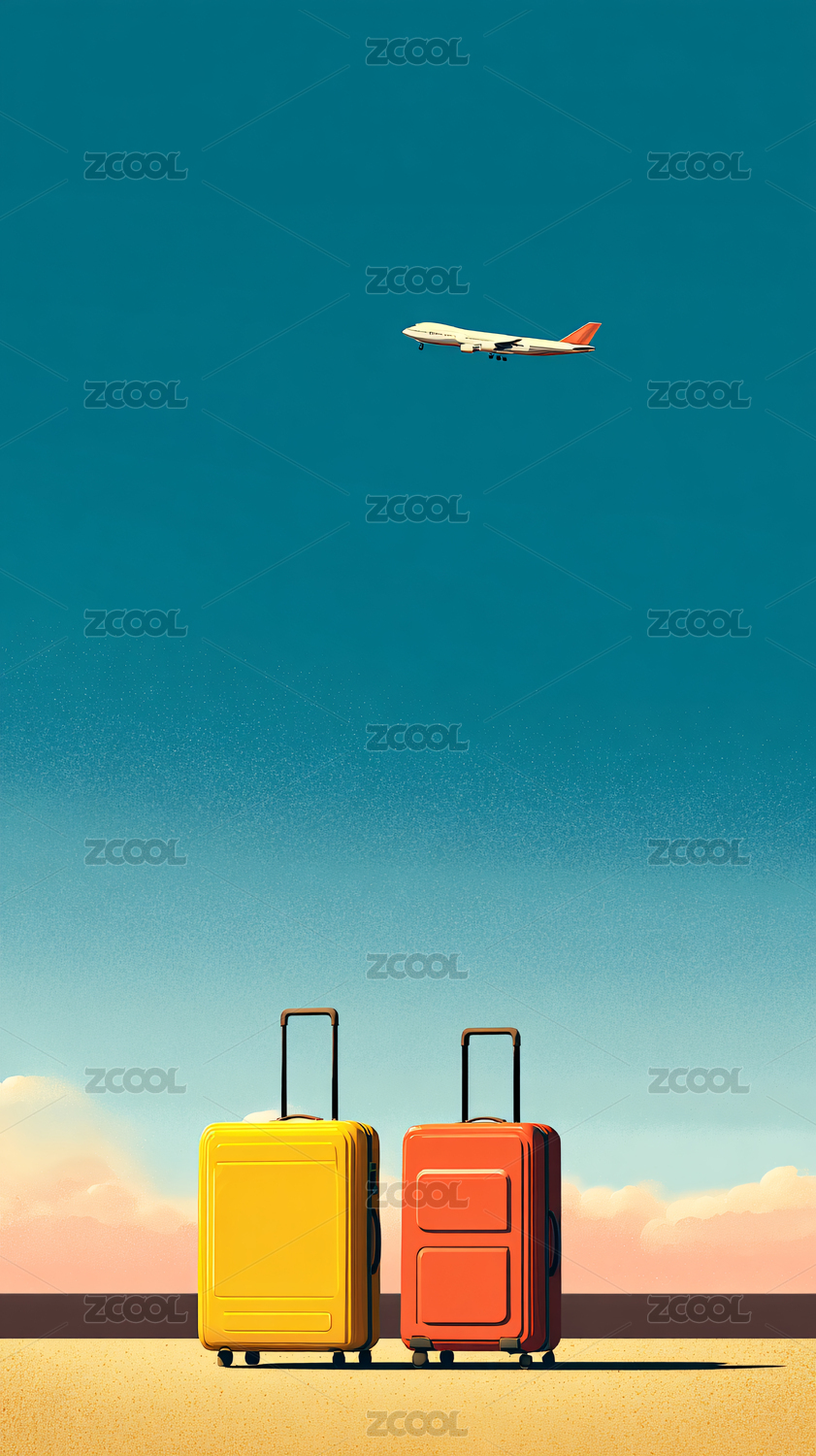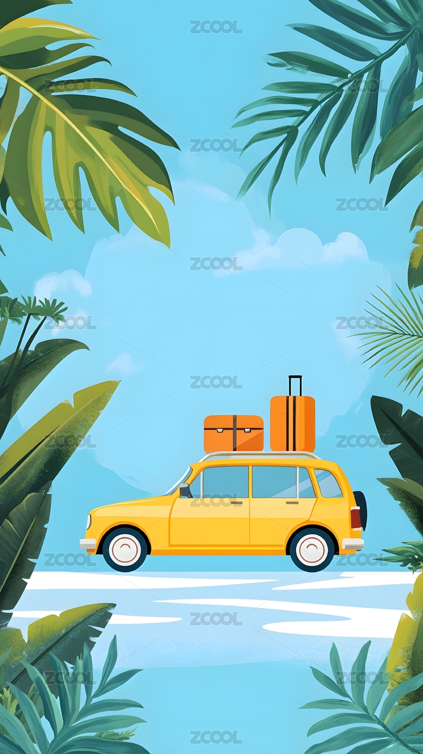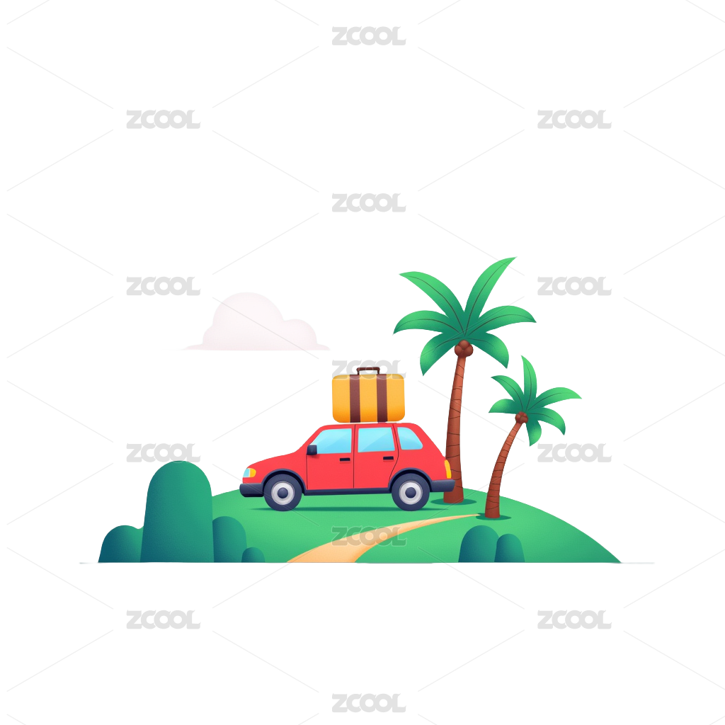 插画,剪纸,旅行箱,旅游,开车,山,马路,树,简洁,白云