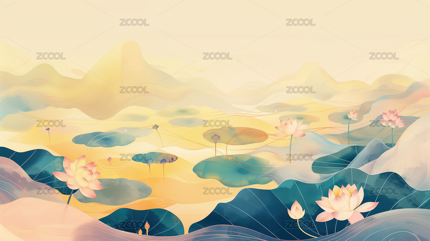国风抽象莲花荷叶风景插画