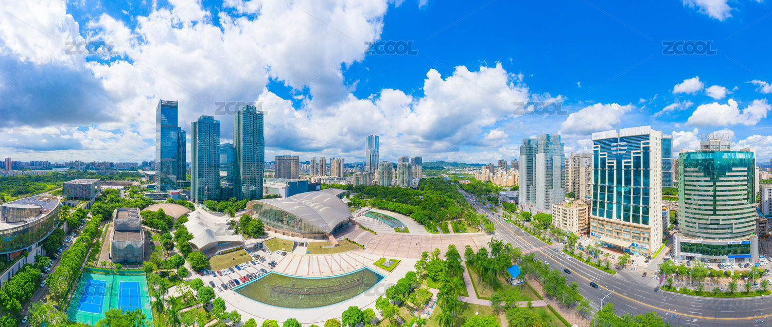Aerial View of Buildings and Parks in Binhai Central Business District and Parks of Haikou City in Hainan Island of China