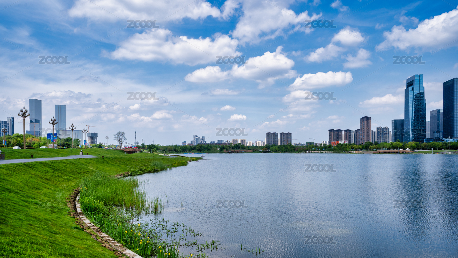 中国浙江上虞曹娥江滨大草坪与高层建筑