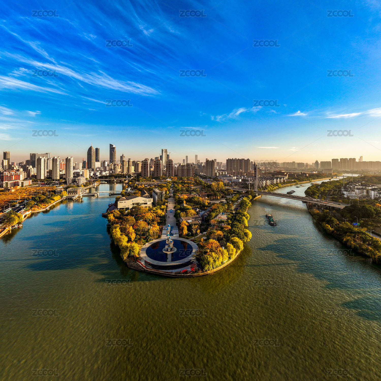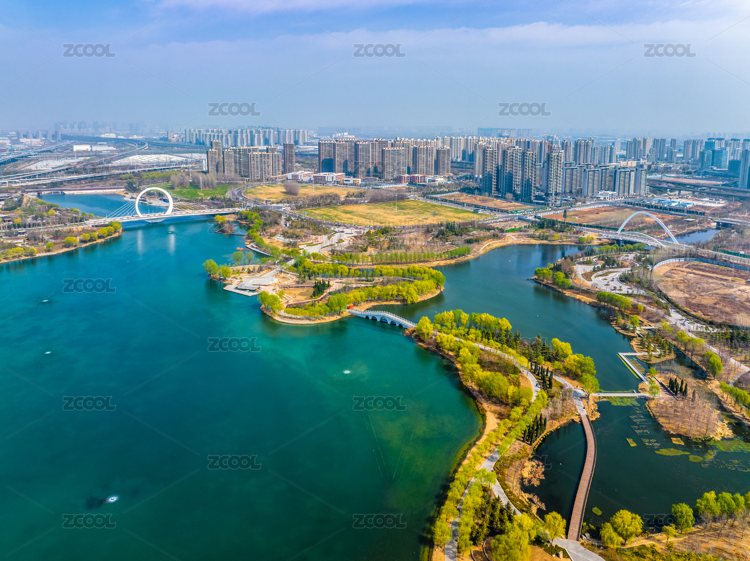 航拍河南郑州郑东新区北龙湖湿地公园风光