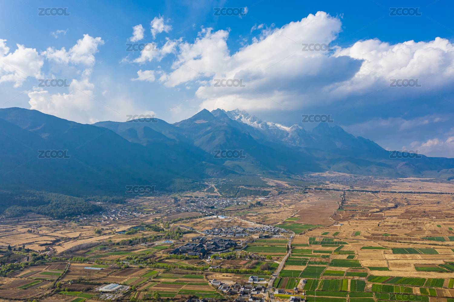 航拍云南省丽江市白沙古镇与玉龙雪山