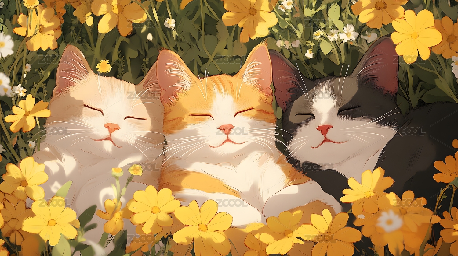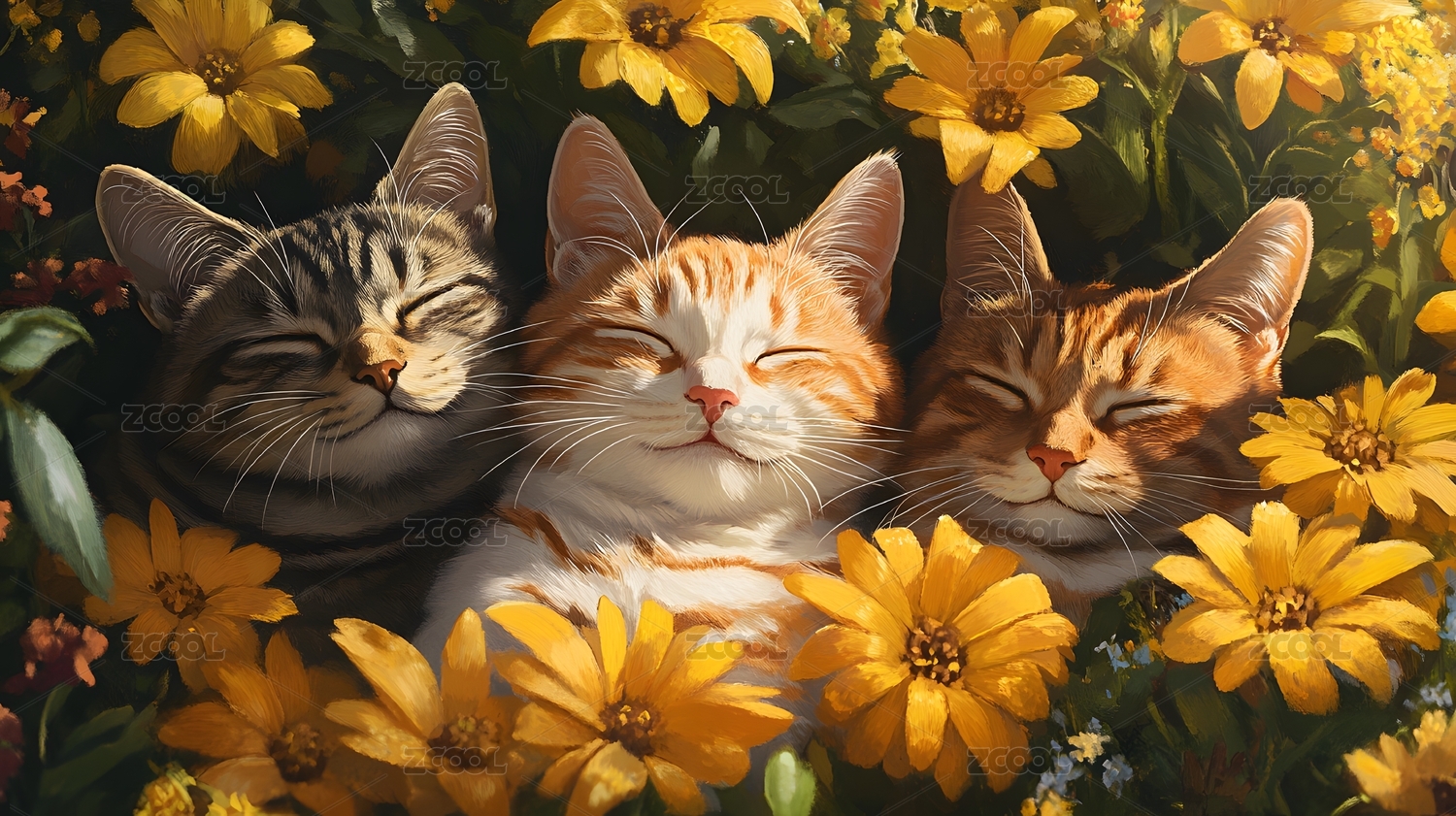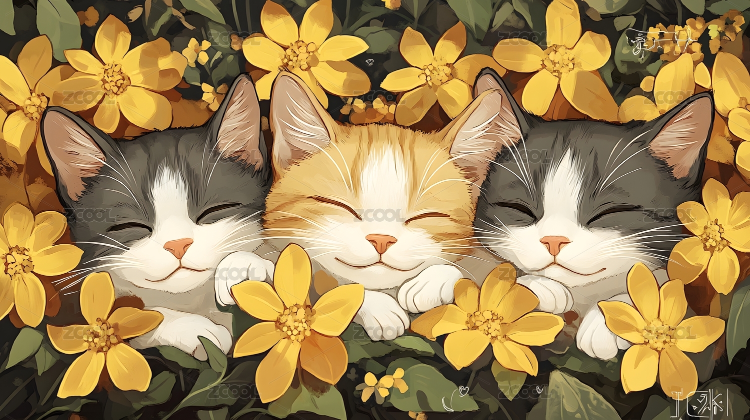 猫咪睡在花丛中绘画作品