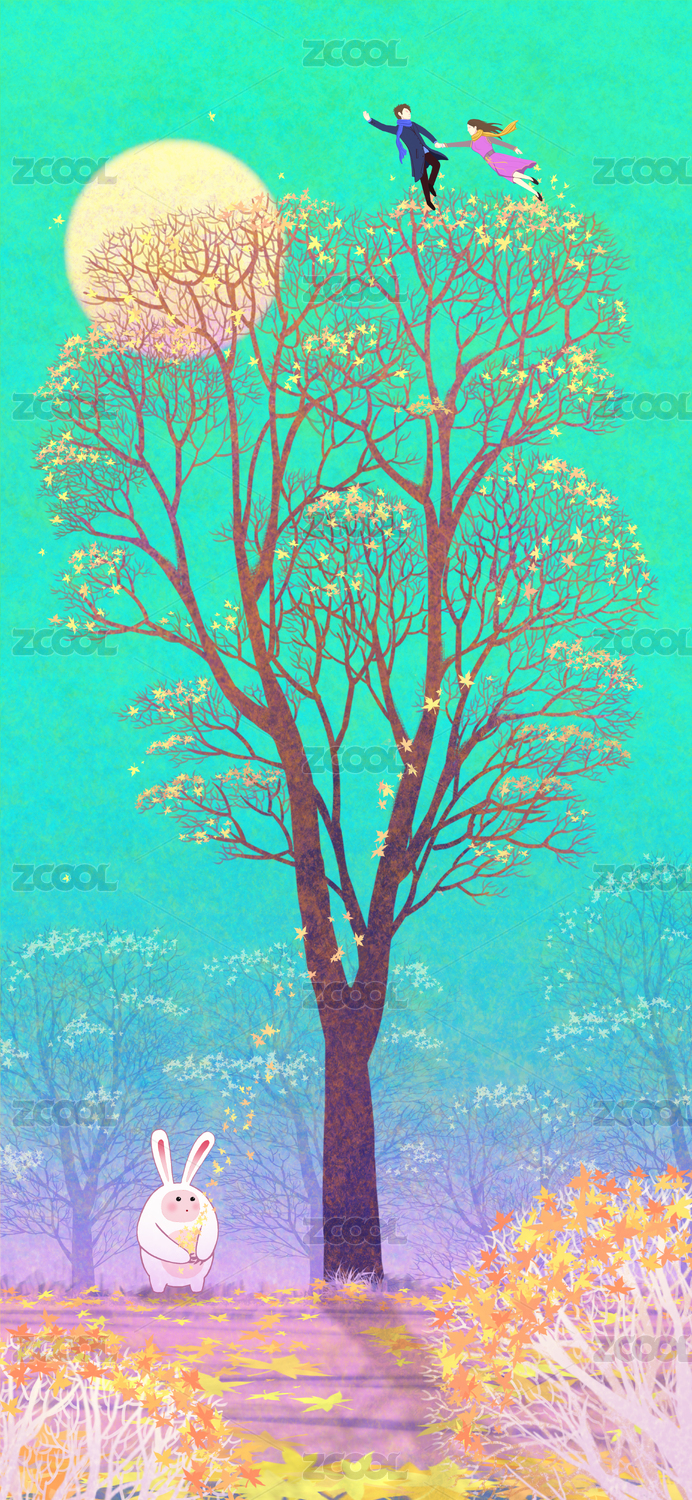 秋天黄昏,树叶纷纷飘落,一对情侣伴着落叶偏偏起舞
