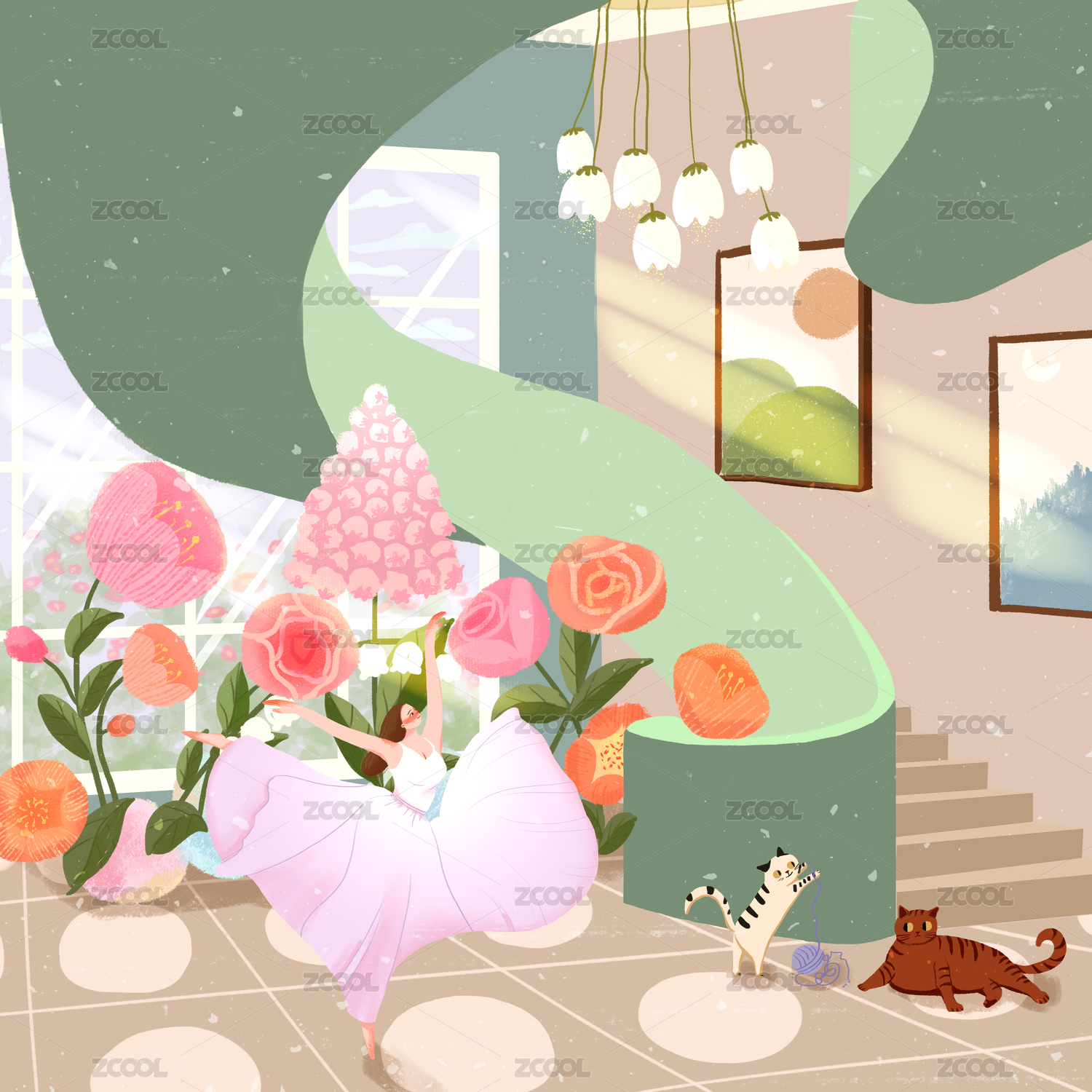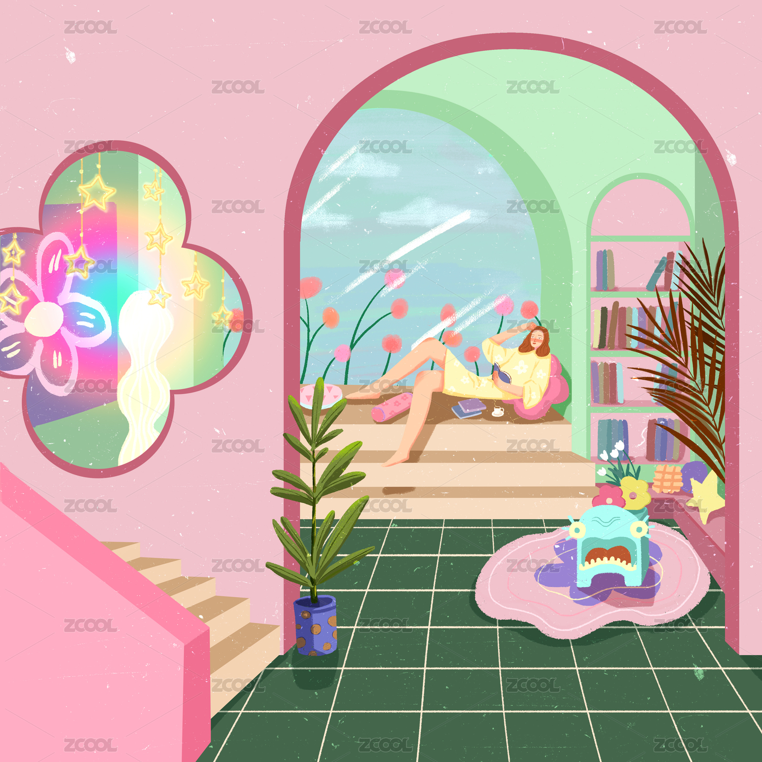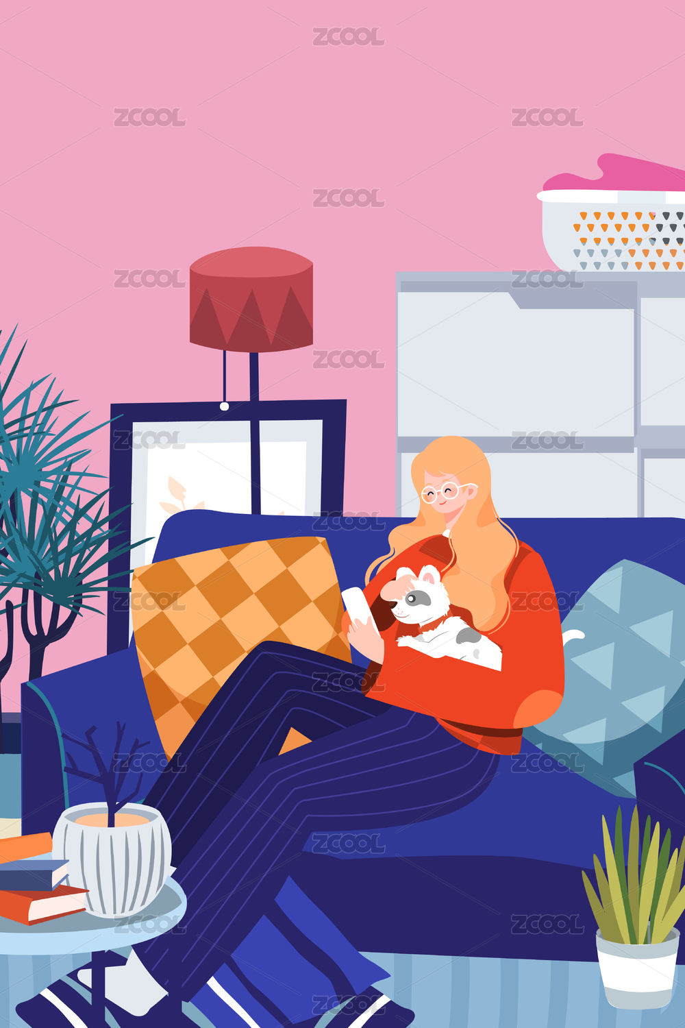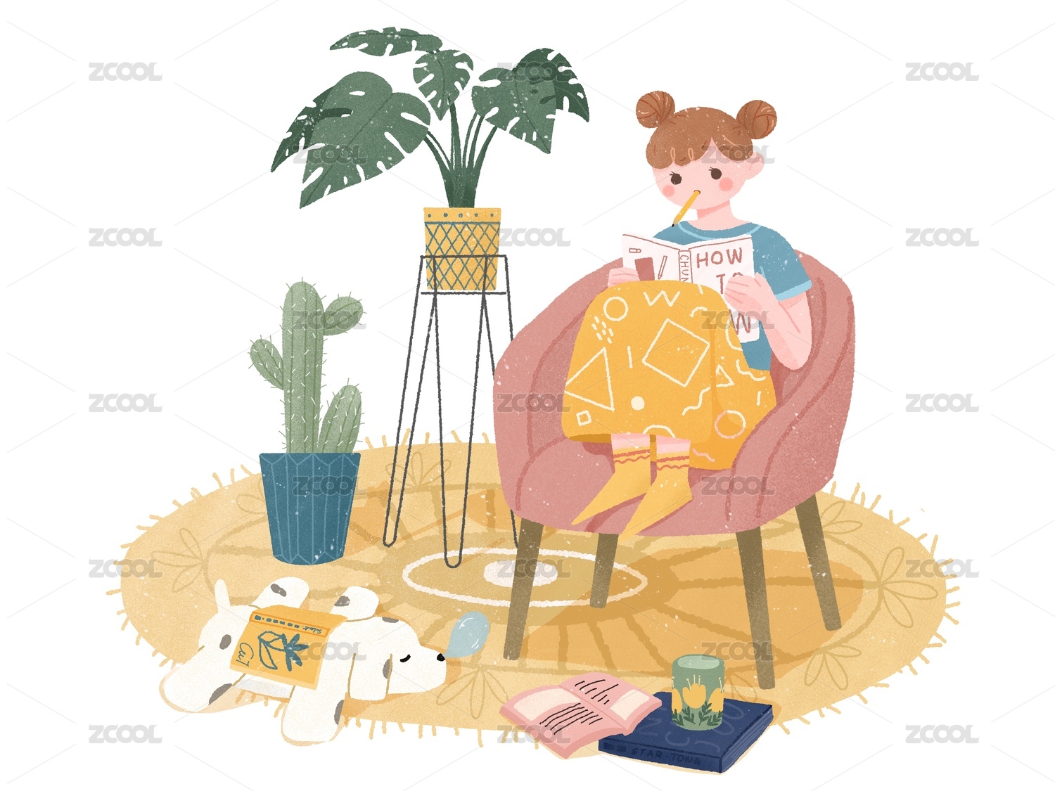 女孩休闲的坐在家里喝茶-扁平画肌理感