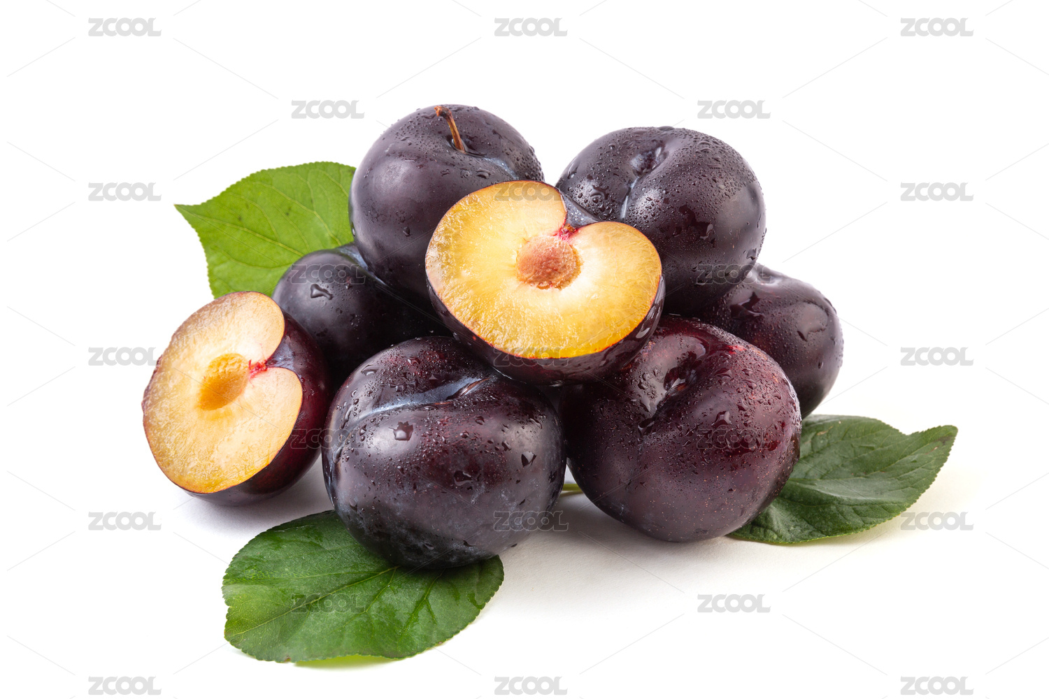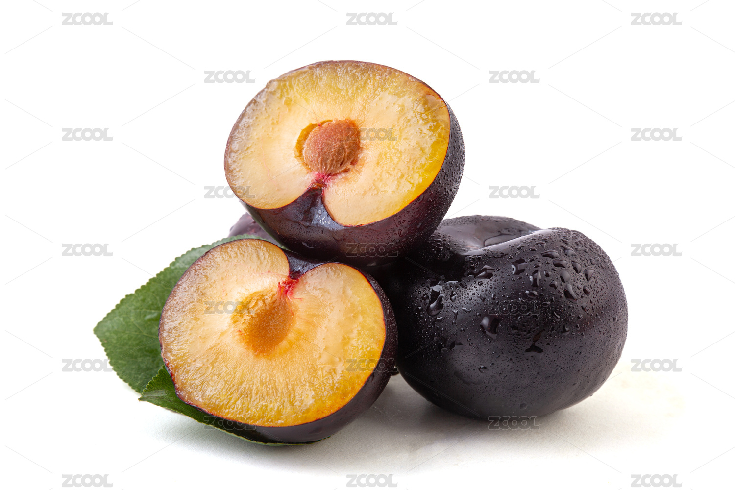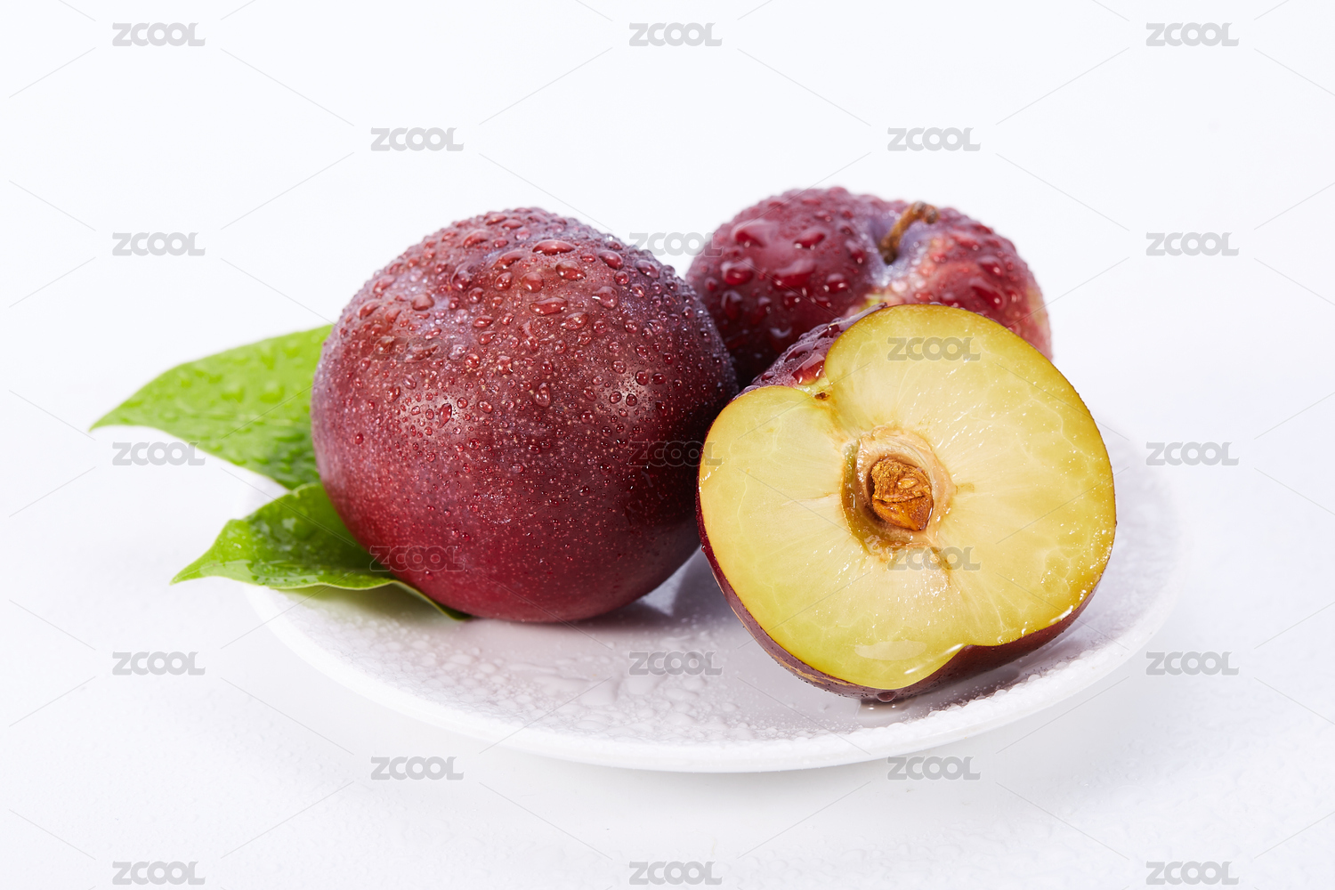 白色背景上带绿叶新鲜李子