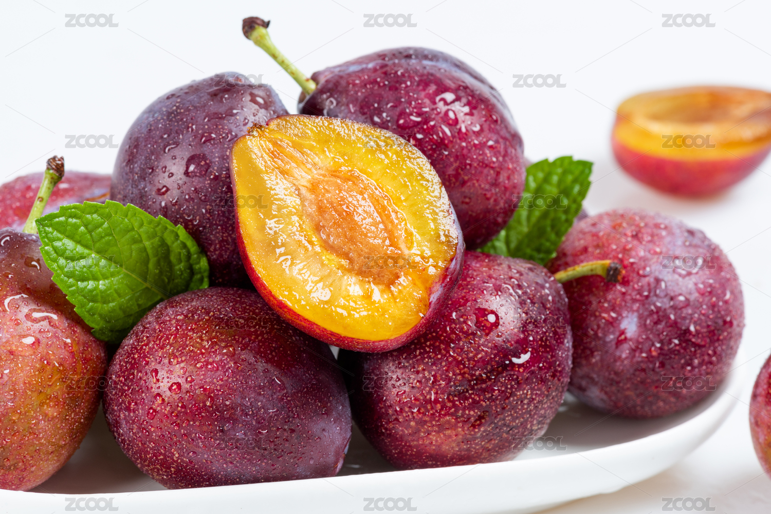 白底上的一盘新鲜西梅