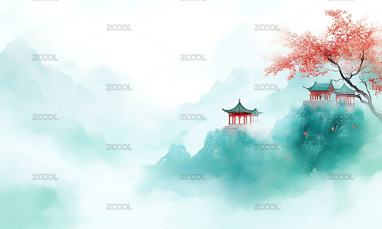 青绿色水墨江南插画