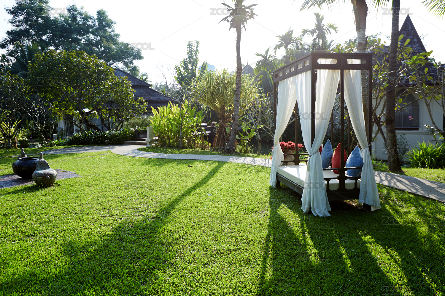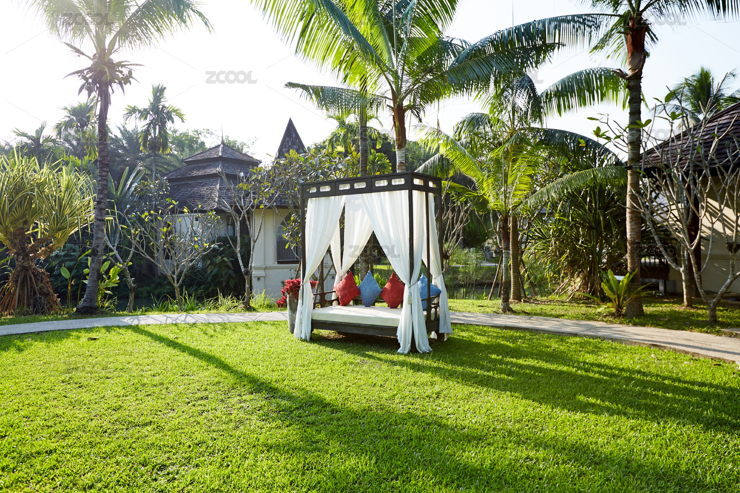 舒服的躺椅床榻,在美丽的花园庭院里