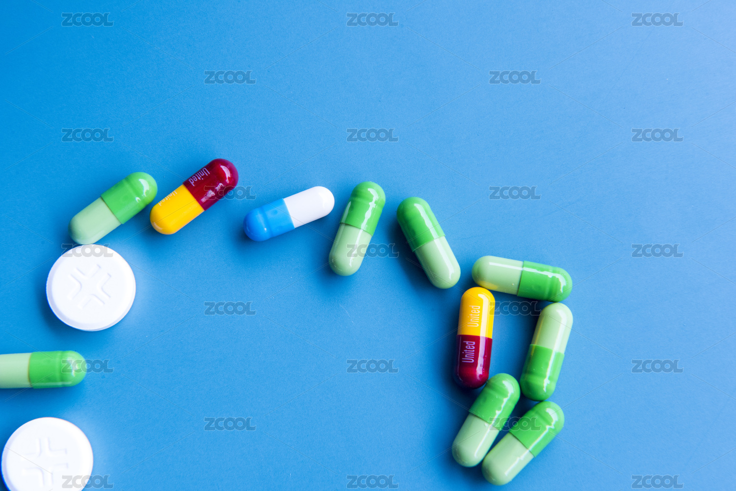 在蓝色背景上用于医疗治疗用中西药药丸胶囊